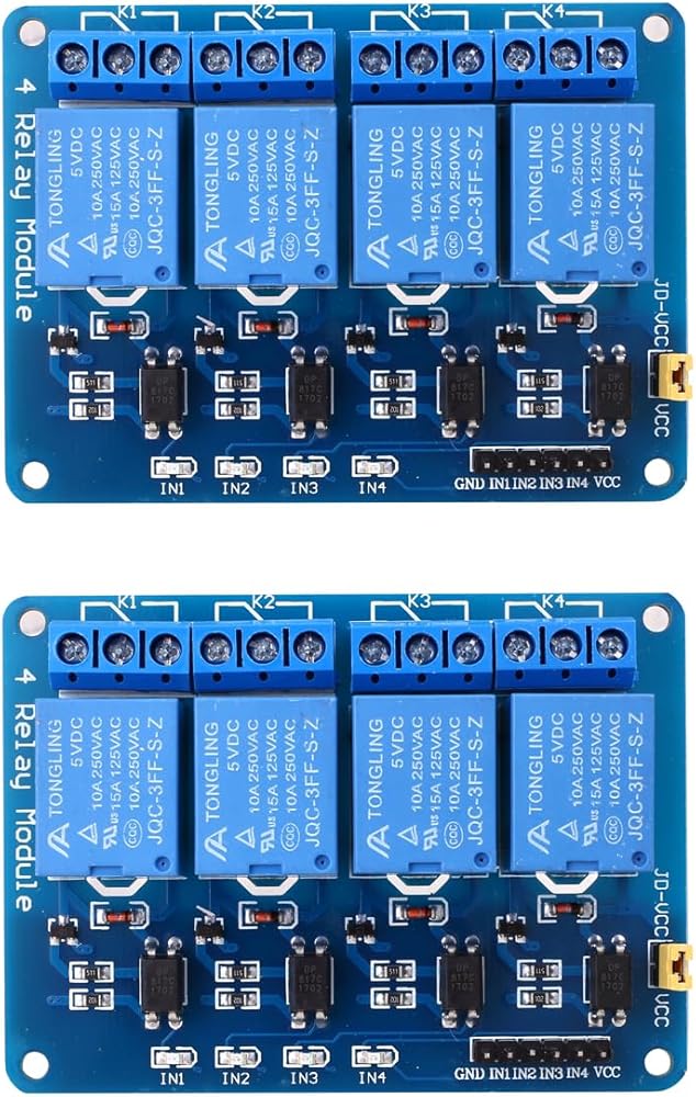 4-channel relay expansion board Can control a variety of household appliances, and high-current loads Adopt high current relay, AC250V 10A DC30V 10A. Contact part of the independent wiring, safe and reliable Standard interface, can be expanded in a variety of development boards With fixing screw holes, easy to install Applicable to 51/AVR/AVR/ARM and other platforms 4-channel relay output module, relay output contact 250A 10A. input IN1, IN2, IN3, IN4 signal line low level effective. vcc, GND power input, can relay separate power supply relay power input JD-VCC.