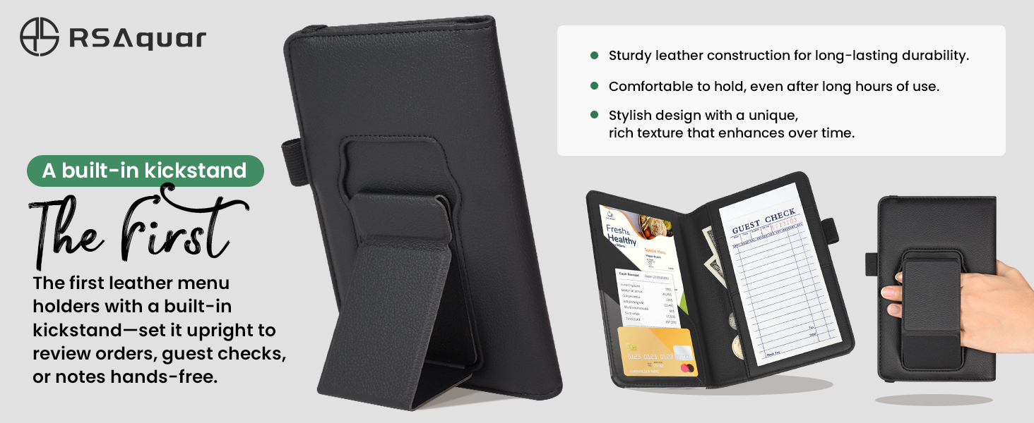 Innovative Kickstand Design: The first server book with a built-in kickstand—set it upright to review orders, guest checks, or notes hands-free. Perfect for multitasking during busy shifts
