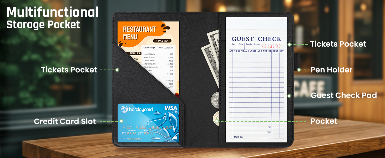 6 Pockets + Pen Holder for Smart Organization: Includes 6 pockets for storing cash, guest checks, cards, or receipts, and a built-in pen holder for quick access—stay organized on the go