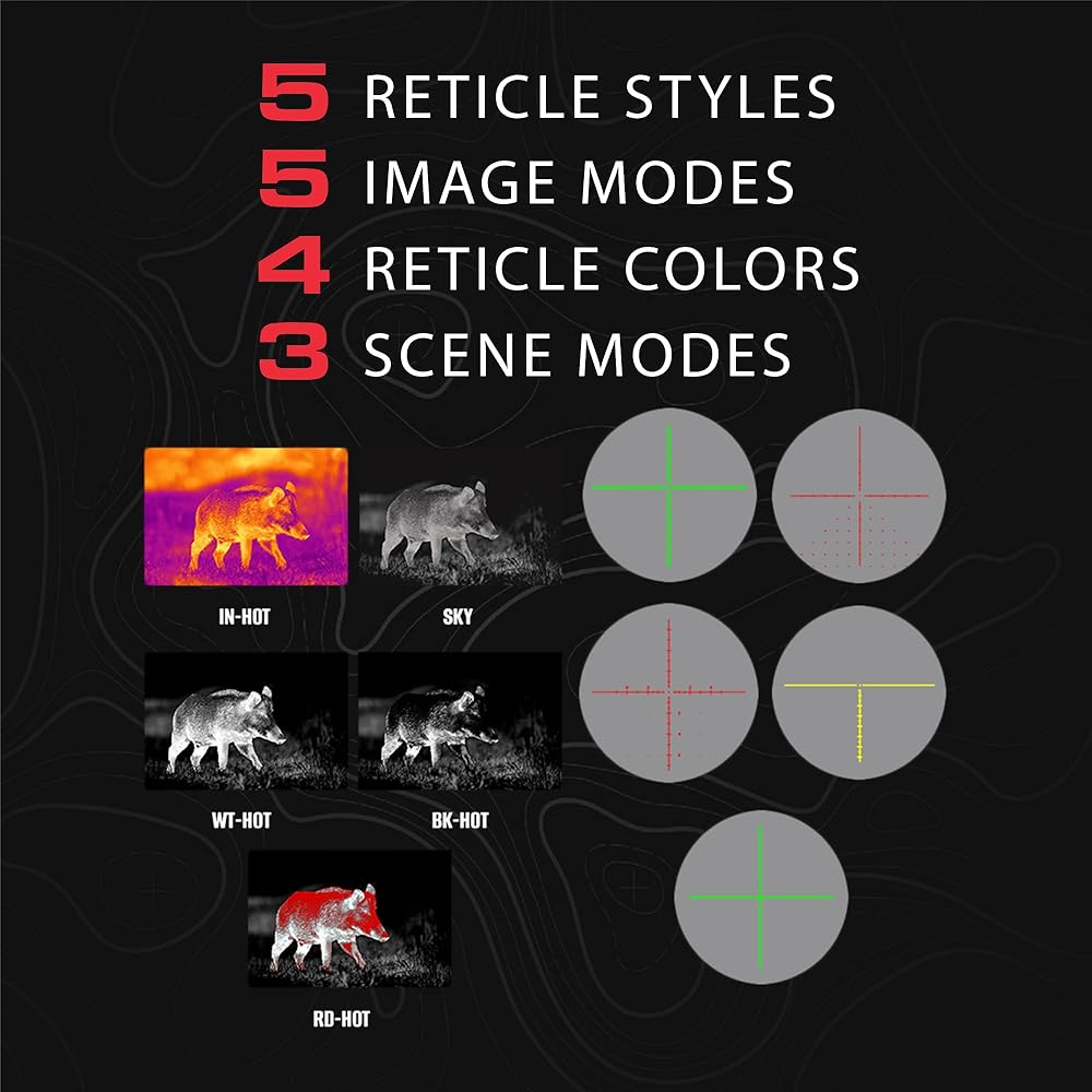 Fully Customizable Imaging with Onboard Recording: Adapt to any environment with 6 thermal color palettes (White Hot, Black Hot, Red Hot, etc.) and 3 scene modes (City/Rain/Forest). Choose from 6 reticle designs in 4 colors to match your preference. Built-in recoil-activated video recording and WiFi streaming let you capture and share every hunt without extra gear.
