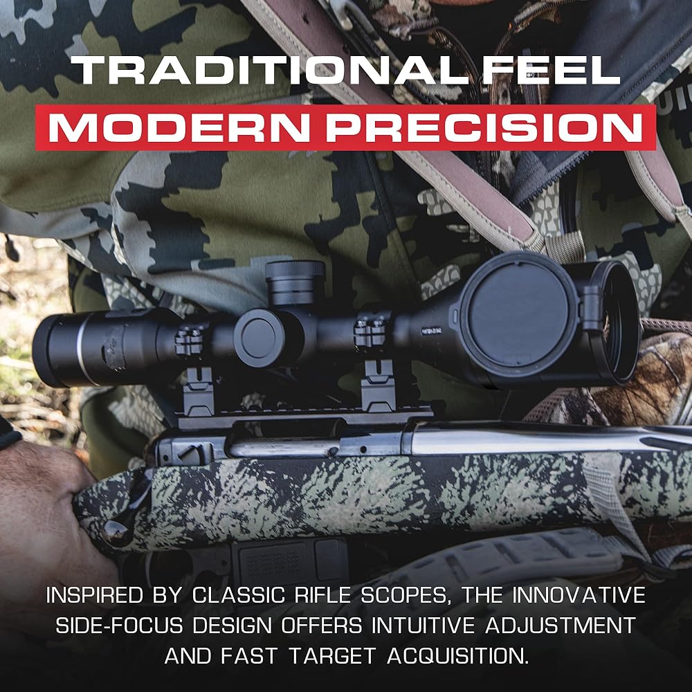 1000m Integrated Laser Rangefinder for Precision Shooting: Hunt with confidence using the built-in 1000-meter laser rangefinder, seamlessly integrated into the objective lens. This design maintains a clean, traditional scope profile without bulky add-ons, providing instant and accurate ranging up to 1094 yards. Know exactly how far your target is before you take the shot.