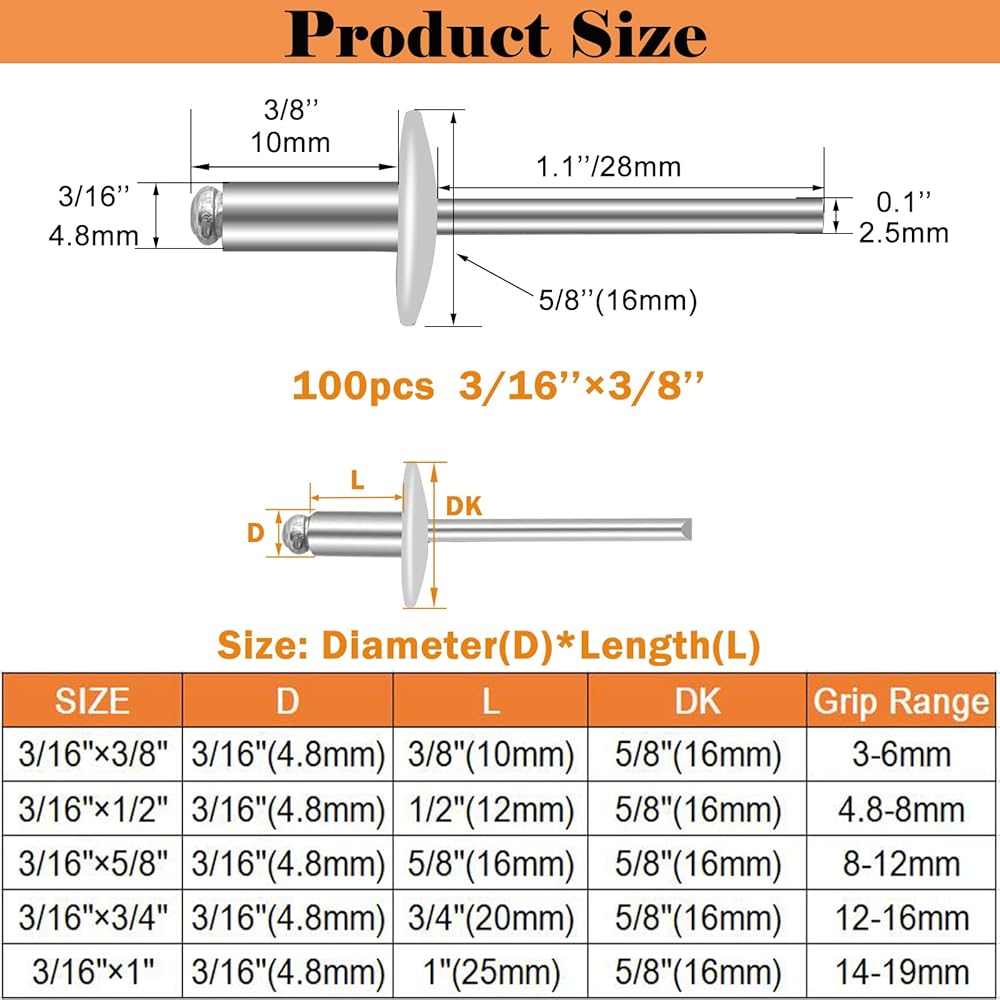 Specifications: This aluminum pop rivets kit includes 100pcs 3/16” x 3/8” (4.8mm x 10mm). Size: Outside diameter of large flange: 5/8 inch (16mm). Recommended clamping range: 3/16 inch (4.8 mm) diameter, recommended riveting thickness: 1/8 inch -1/4 inch (3-6 mm).