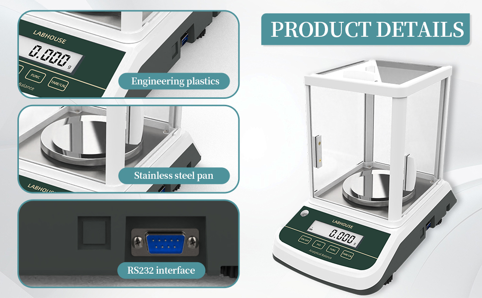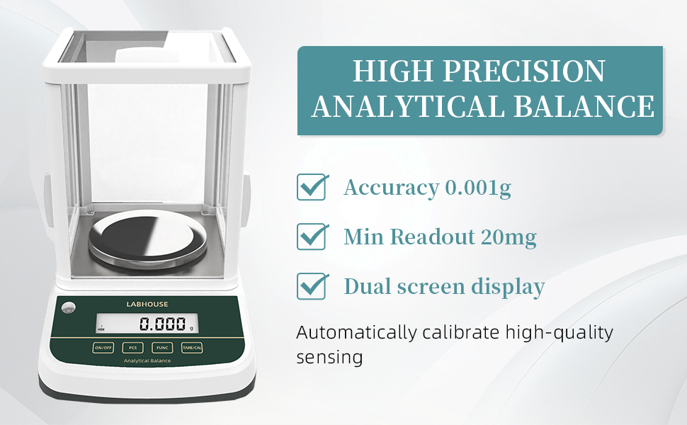 【HIGH ACCURACY】LABHOUSE 0.1mg/200g analytical scale features a three-sided glass windshield, a high-precision sensor and a stable base. It eliminates the effects of air currents, minor vibrations and temperature variations, and provides precise computing power and data processing to ensure weighing accuracy and stability LABHOUSE 0.1mg/200g