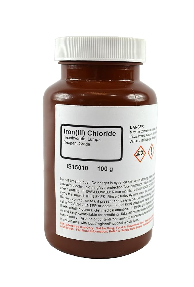 Innovating Science Iron (III) Chloride 6-Hydrate (100g) is a reagent-grade, highly soluble inorganic compound used in scientific, industrial, and research applications. It serves as a coagulant, metal etchant, and Lewis acid catalyst in various chemical processes.