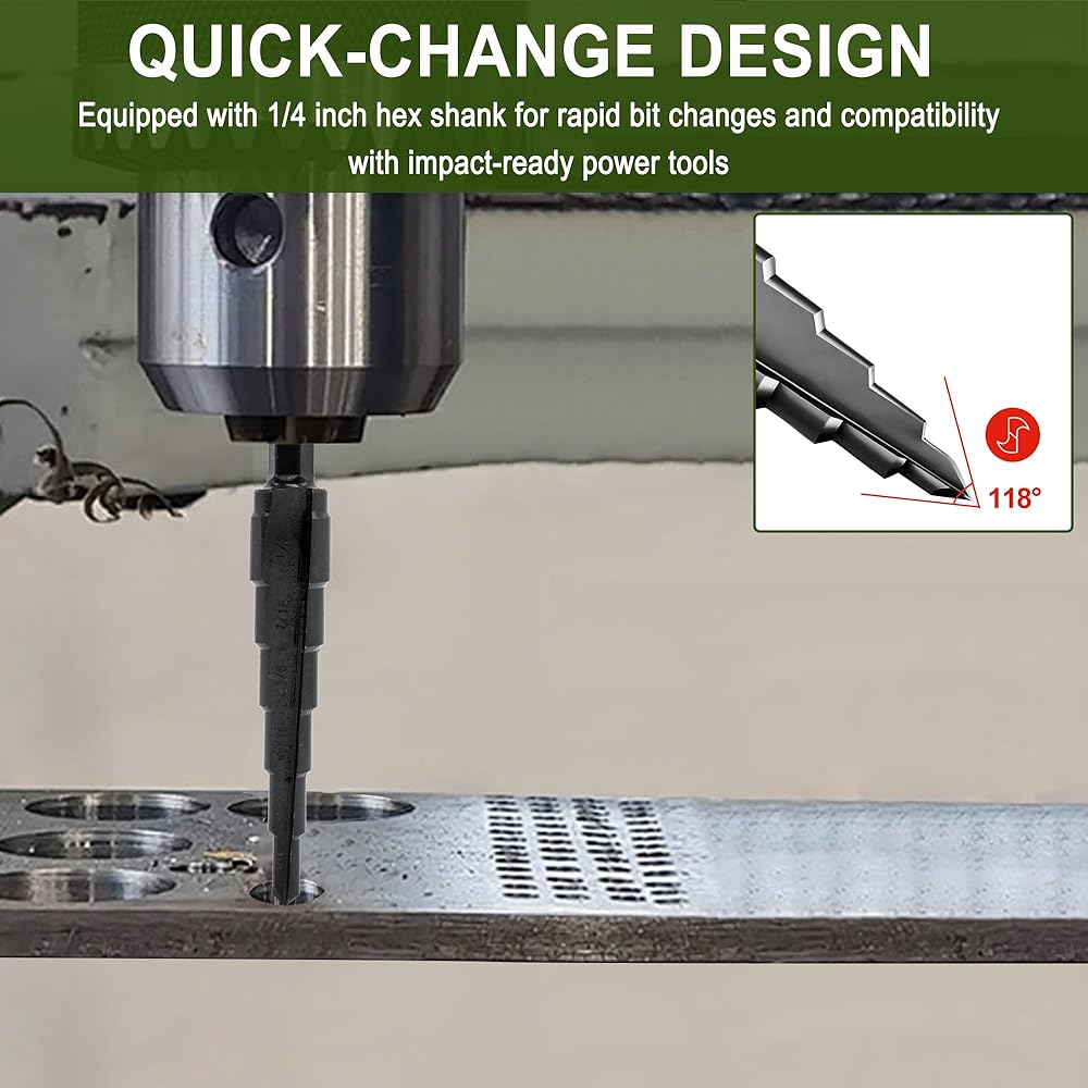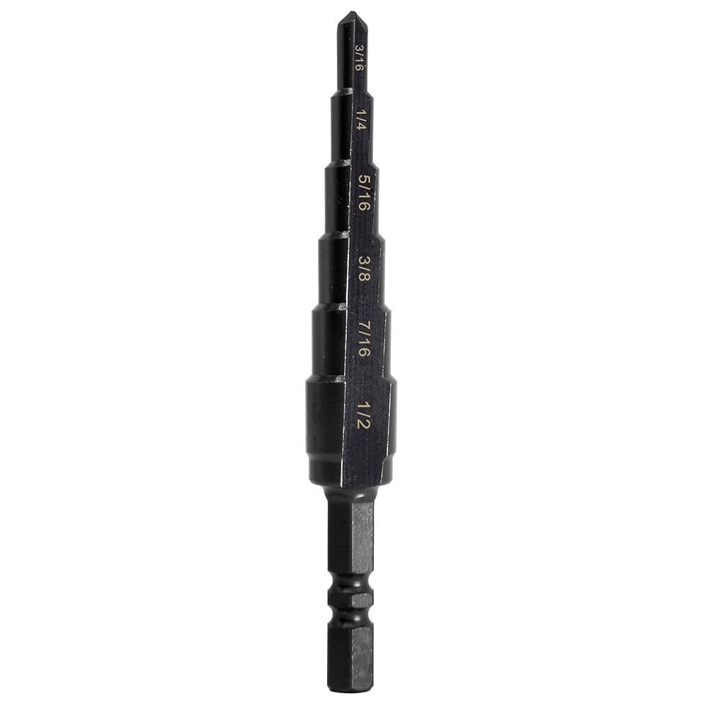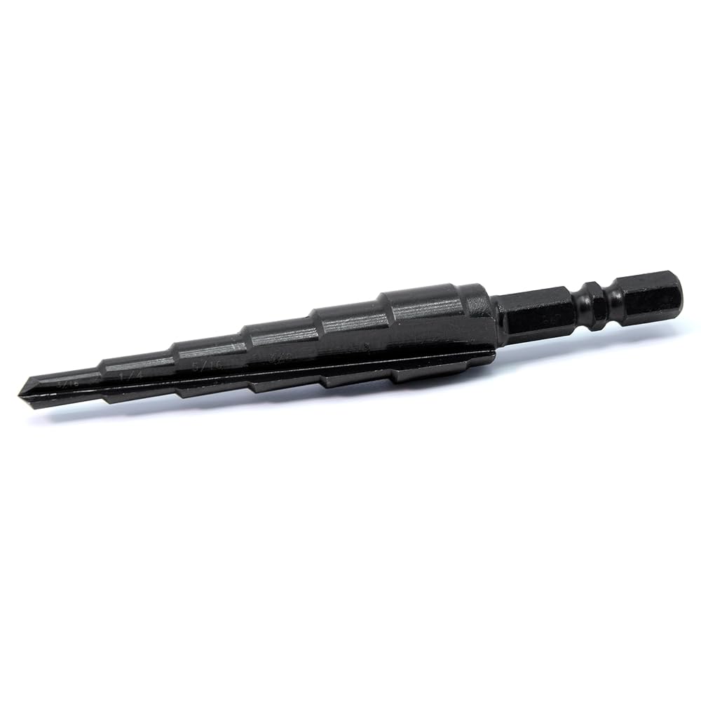 Transform your drilling experience with this premium M2 HSS step drill bit featuring six clearly marked sizes from 3/16" to 1/2". The double-fluted design, enhanced with higher concentrations of Tungsten and Molybdenum, delivers exceptional durability and cleaner holes compared to standard bits. The polished steps with highlighted size markings allow continuous drilling without interruption for size checks. This versatile bit excels at cutting through various materials including stainless steel (up to 12ga/2.7mm thickness), hardened metal, mild steel, galvanized steel, aluminum, copper, plastic, and wood. The quick-change 1/4 inch hex shank ensures compatibility with impact-ready power tools for swift bit changes. Thanks to precision CNC processing and optimized design features, this step bit offers superior cutting performance while eliminating the need for multiple individual drill bits. The high-speed steel construction with vacuum heat treatment and nitride surface hardening ensures lasting performance across demanding applications.
