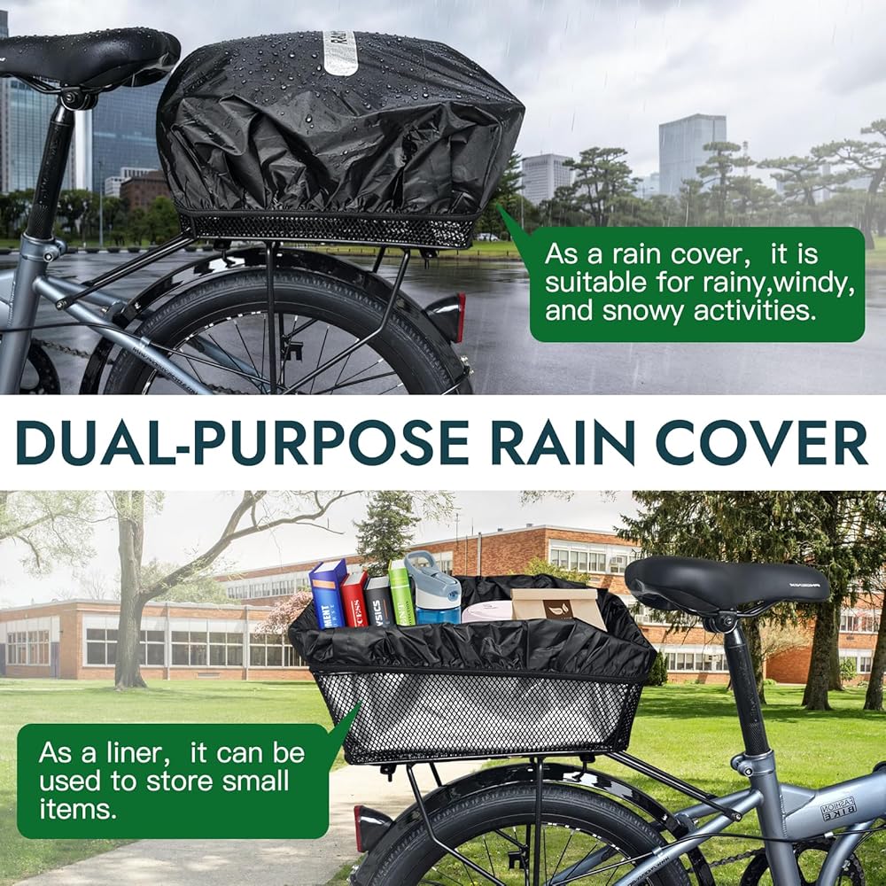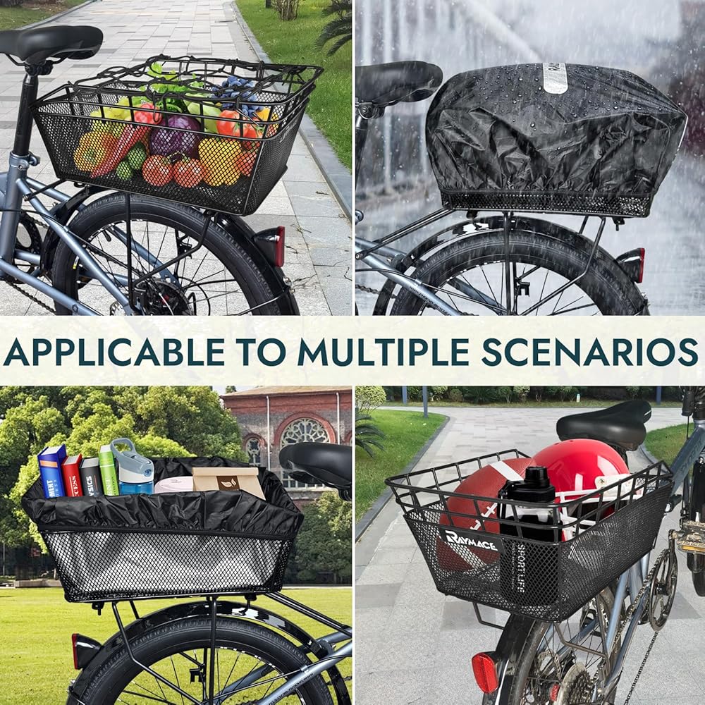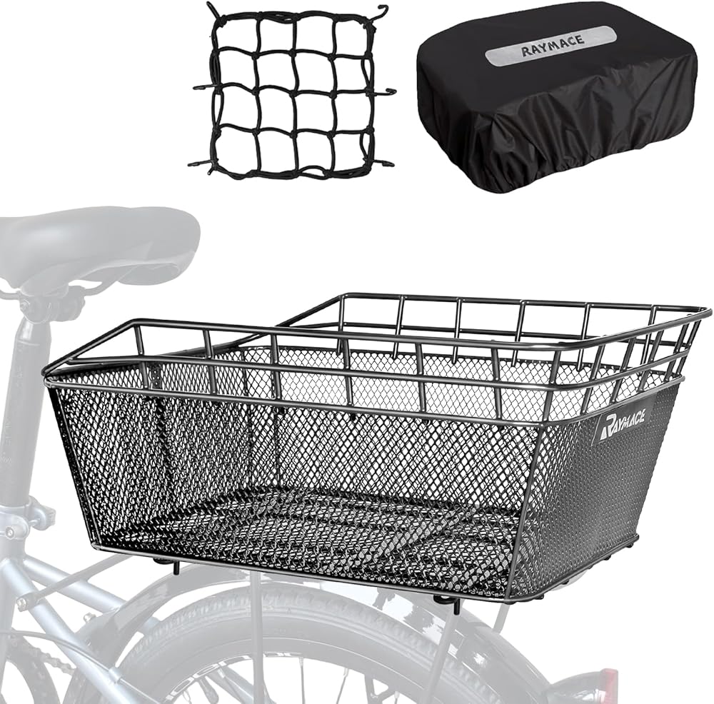 RAYMACE Bike Basket Rear with Cargo Net and Waterproof Cover, Wire Bicycle Basket Large Capacity Storage, Fits for Most Bicycle and Electric Bike with Rear Rack