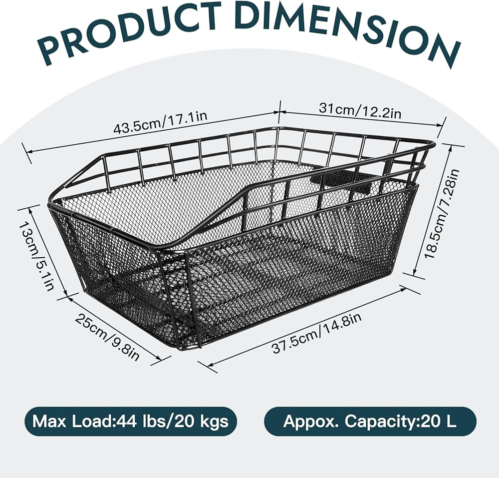 Rust-Resistant & Durable Build: Constructed from sturdy steel with an electrostatic spray coating to resist corrosion. This rear rack basket offers reliable stability and a robust carrying capacity of up to 44 lbs, perfect for daily use and a variety of loads.