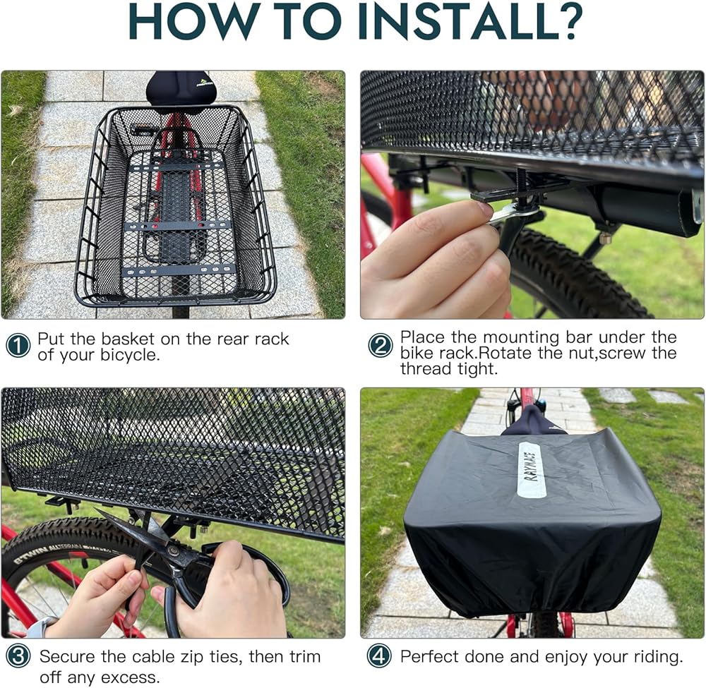 Installation Kit: The package comes with a full set of screws and nylon zip ties designed to be used together. This enhances stability when mounting the rear basket to your bike's rear rack (Note:bicycle rear rack is not included), ensuring a safe and secure fit for various models.