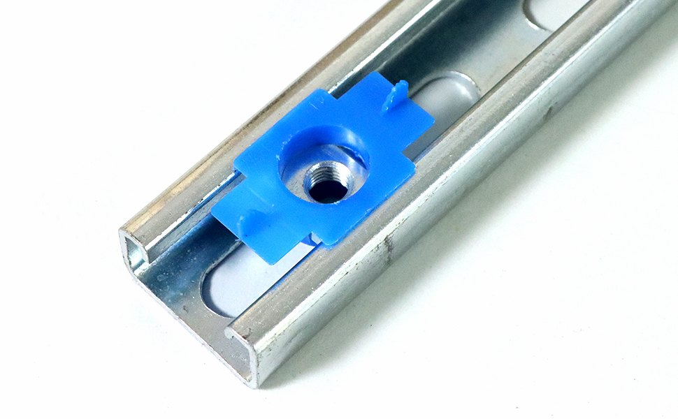 Simply place a strut channel squeeze cone nut into unistrut then rotate the tab to secure