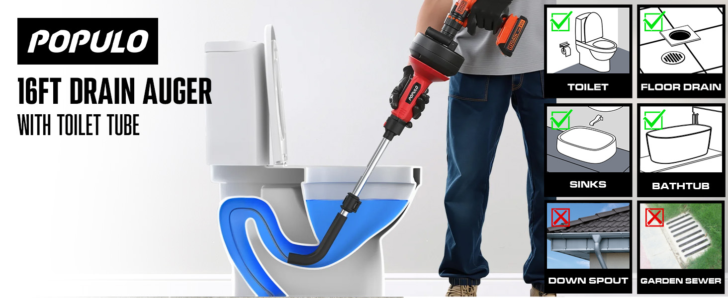 UPGRADED TOLIET AUGER - This drain snake plumbing tool is POPULO's second-generation Drain Auger, which comes with a dedicated toliet tube. It's the latest technology for all scenarios.