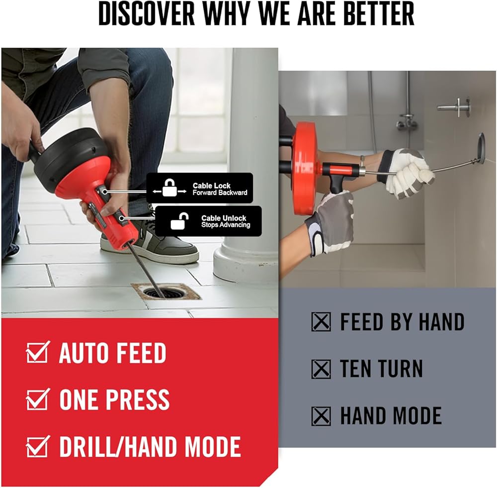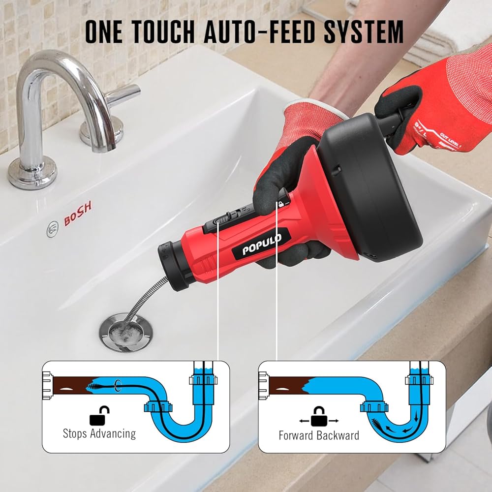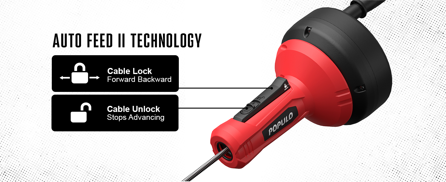 AUTO FEED SYSTEM - This plumbing drain clog remover uses a simple button controls the cable's advancement and rotation. The handle and drill drive the cable without the need of manual force. It's labor-saving and hygienic!