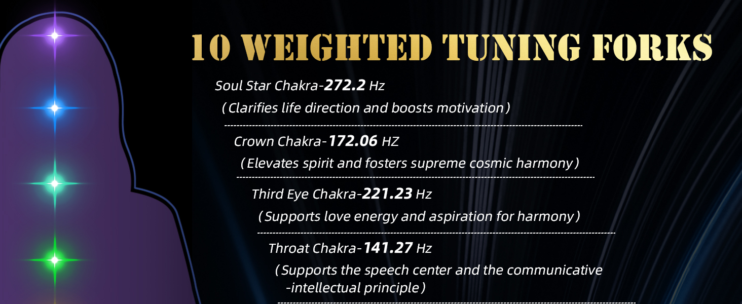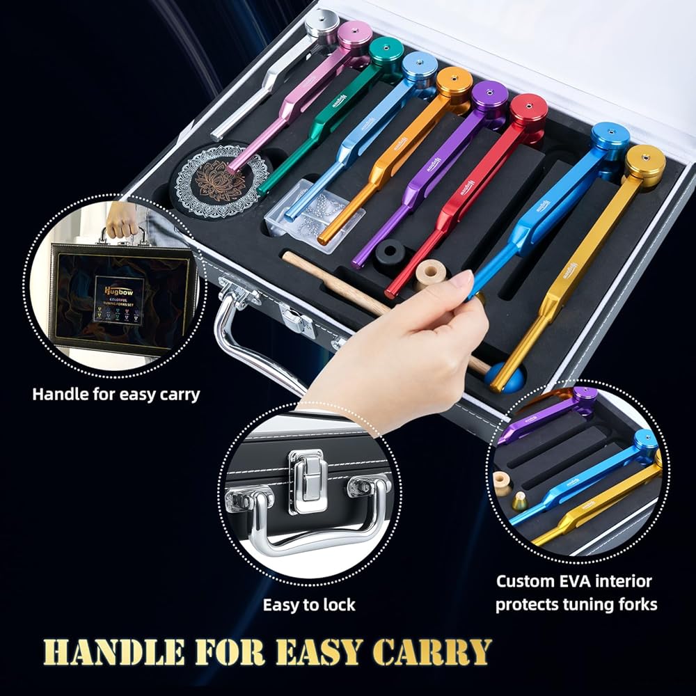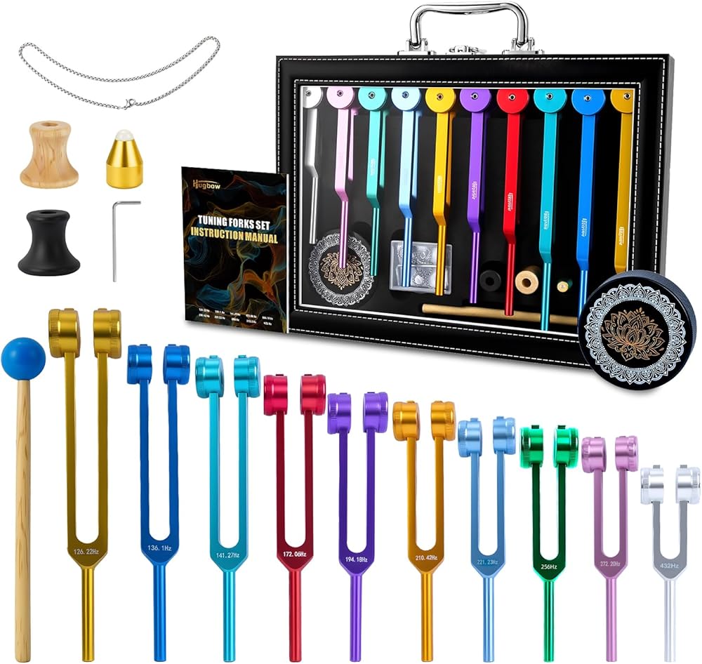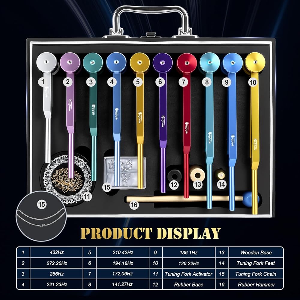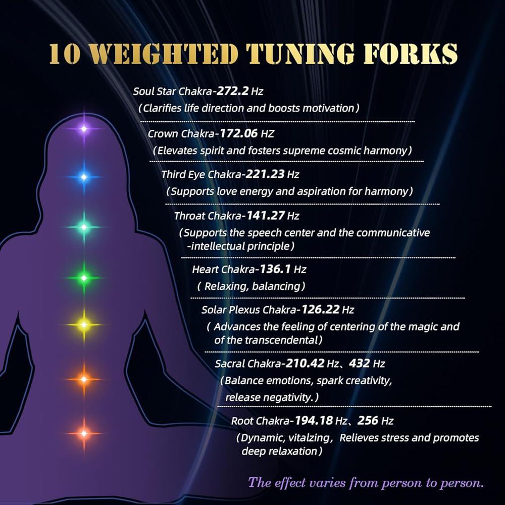【10 Weighted Tuning Fork Set】10 healing frequencies: 126.22 Hz, 136.1 Hz, 141.27 Hz, 172.06 Hz, 194.18 Hz, 210.42 Hz, 221.23 Hz, 272.2 Hz, alongside the 256 Hz and the 432 Hz cosmic harmony fork.Ideal for chakra balancing and deep sound therapy,it also supports energy body healing, and emotional release.