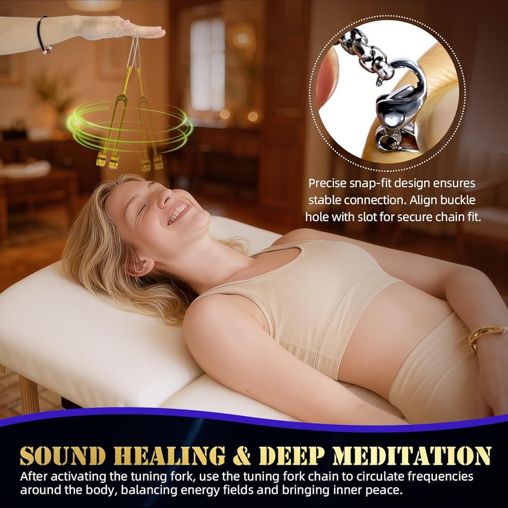 【Easy to Use with Accessories】Comes with a tuning fork chain (circulate frequencies around the body), a reflex hammer , and a tuning fork activator for versatile striking options. The tuning fork feet disperses vibrations gently into the body, promoting relaxation and slight vasodilation for enhanced well-being.