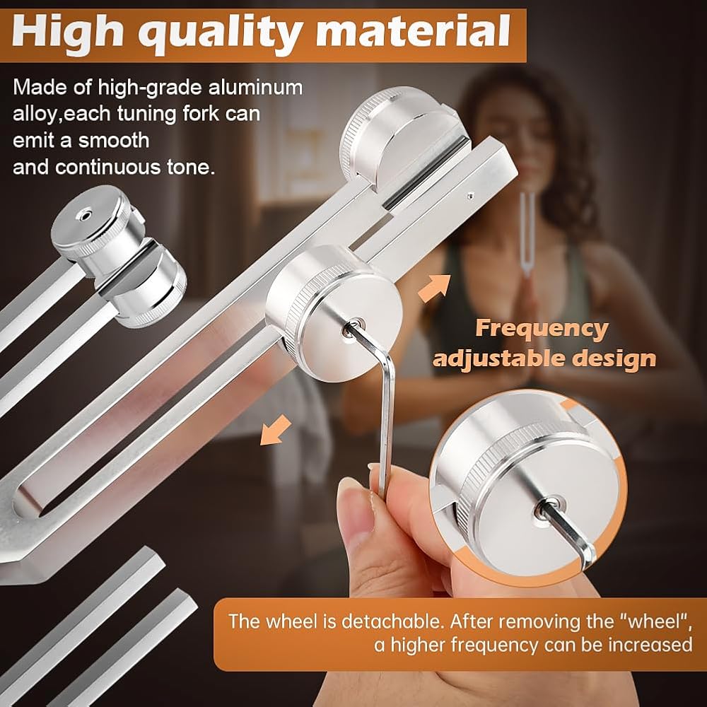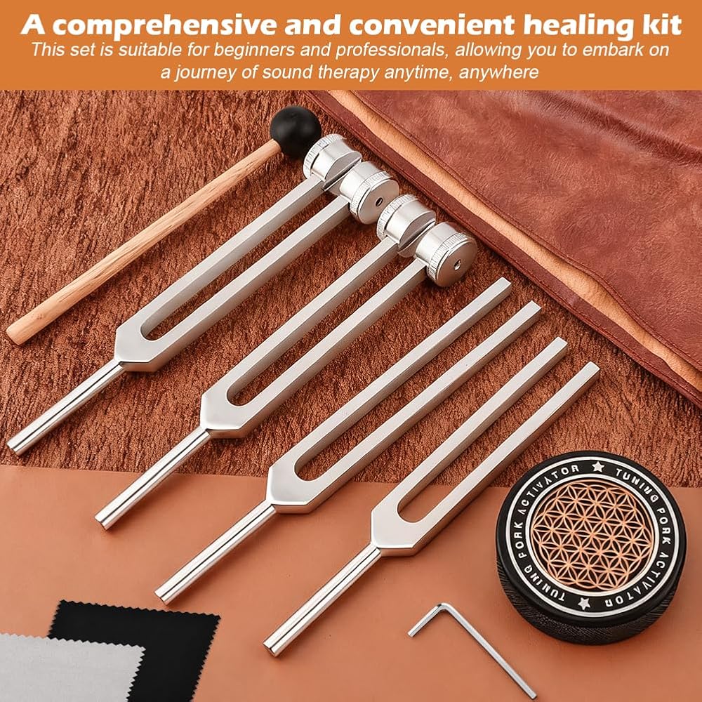 Embark on a transformative of relaxation and healing with this comprehensive tuning fork kit. Designed for both beginners and experts, the set features four meticulously calibrated forks (128Hz, 136Hz, 256Hz, 384Hz) to enhance meditation, yoga, and stress relief. Each fork is crafted from durable aluminum, delivering pure, resonant vibrations that promote balance and mindfulness.