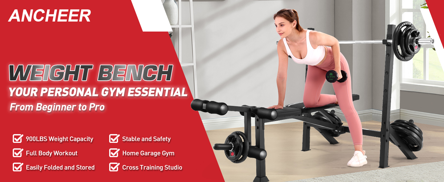 【Versatility for Full-Body Training】Maximize your gains with our all in one weight bench set solution! ANCHEER premium workout bench combines a fitness bench and leg developer into one, perfect for flat/incline/decline bench press, dumbbell flyes, shoulder press, sit-ups and leg curls. It is ideal for comprehensive strength training targeting the chest, shoulders, back, abs, arms and legs