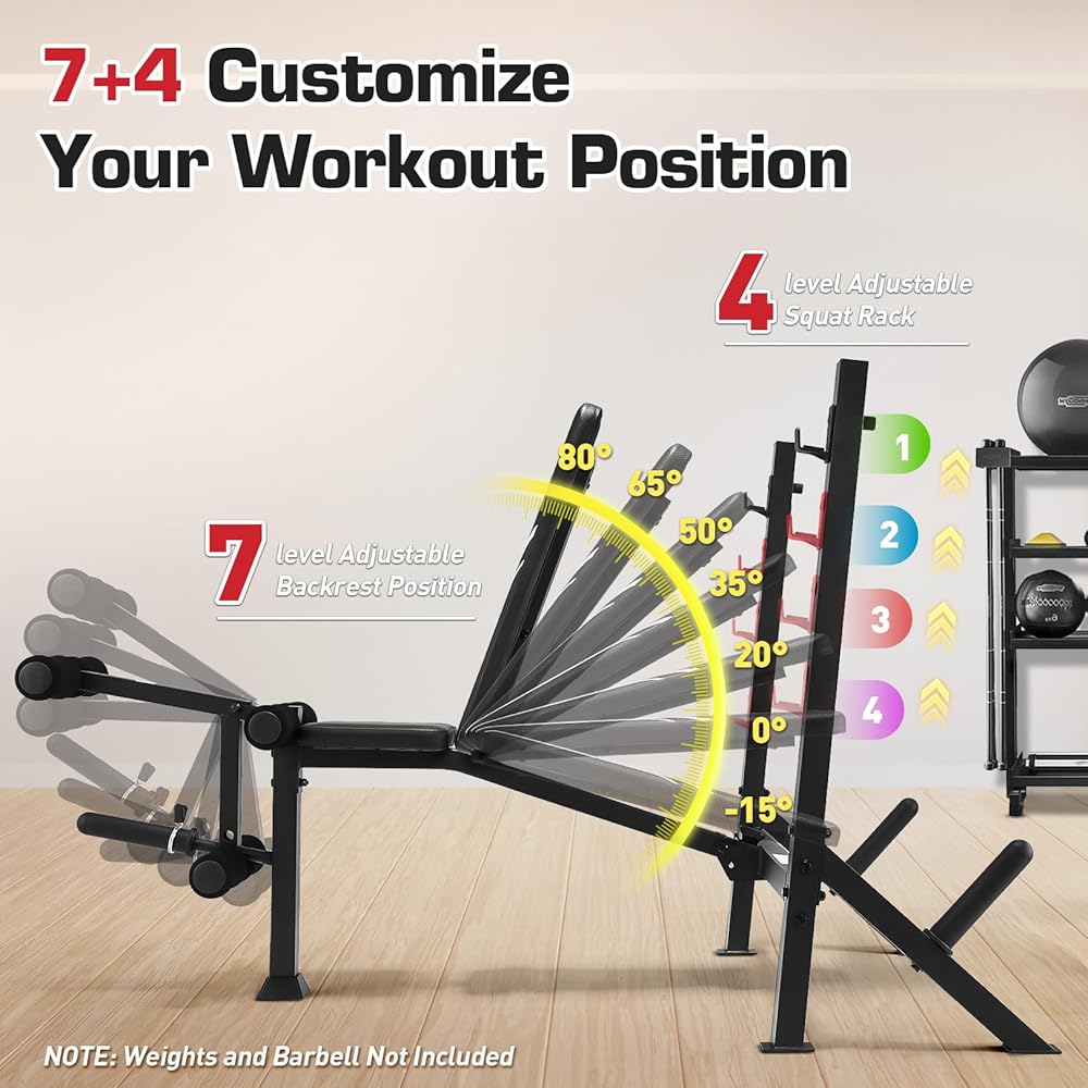 【Pro-Level Adjustable Weight Bench】Upgraded 7-angle backrest (from -20° to 85° incline) enables perfect form for decline presses, shoulder rehab, or ab workouts. 4 adjustable bench press rack heights and the wider 40'' rack accommodate various barbell sizes and training styles