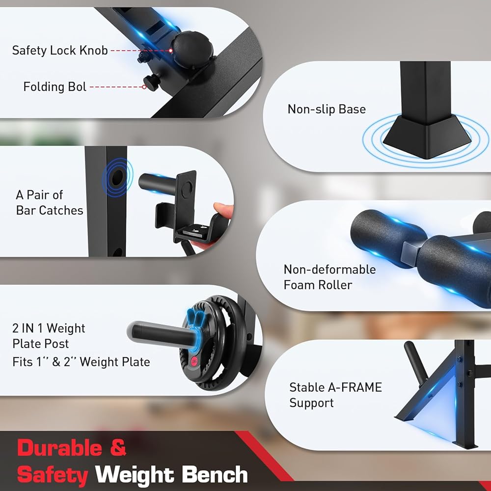 【Heavy-Duty Construction & Stability】Built to last with an industrial-grade 2.5mm steel frame and reinforced triangular safety architecture, Weight plates can be placed on the front and back tubes to ensures maximum stability during intense workouts, supporting up to 900 lbs weight capacity, making it suitable for both beginners and advanced lifters. Non-slip rubber feet protect your floor while preventing any unwanted movement