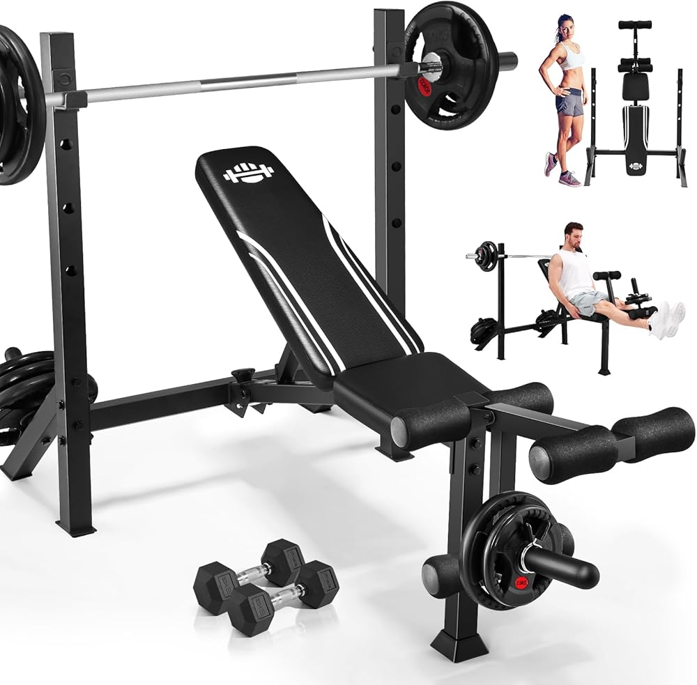 Adjustable Weight Bench Press Set 900LBS with 72''W Squat Rack & Leg Extension/Curl Foldable Workout Bench for Full Body Fitness Flat/Incline/Decline Upgrade Weight Benches for Home Gym