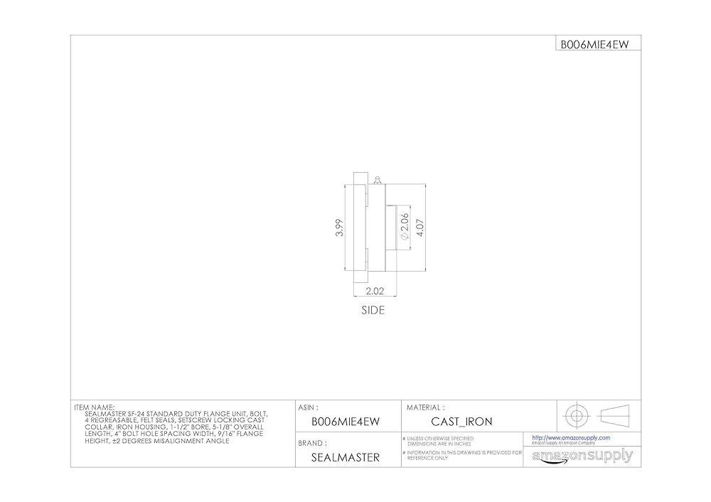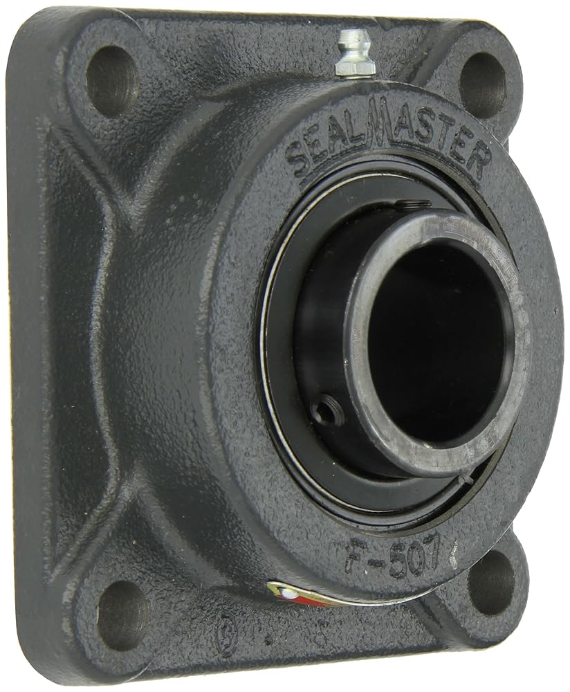 This Sealmaster SF standard-duty flange unit has a cast iron housing with four bolt holes, felt seals, and setscrew locking collar. It is designed for mounting onto bearing surfaces perpendicular to the shaft axis. The one-piece housing has machined foot pads and is made of solid cast iron for rigidity and vibration damping. It is equipped with a grease fitting on the outer surface for reapplying lubricant. A locking pin-and-dimple system feeds oil through the bearing and prevents outer-ring rotation within the housing. The double-sealed, deep-groove ball bearing cartridge insert in the housing is rated "standard duty" for applications with moderate radial loads and light to moderate thrust or combination loads. The bearing is made of vacuum degassed 52100 chrome steel, and the inner and outer races are coated with black oxide for corrosion resistance. The inner ring is extended to provide extra shaft support. A pin and dimple anti-rotation rivet on the outer ring prevents rotation of the ring in the housing, reducing heat buildup and prolonging the bearing life. This self-aligning bearing has a convex sphered outer surface that compensates for misalignments. Low-friction felt labyrinth seals on both sides of the bearing retain lubricant applied at manufacture and help keep contaminants out. For added protection, flingers on the inner ring deflect contaminants away from the seals. The bearing locks onto the shaft with two setscrews spaced 120 degrees apart for a three-point contact hold. This lock type minimizes ring distortion and vibration and is suitable for low to moderate speed applications where the shaft rotates in a single or reversing direction. Flanged bearing units are suitable for use in industrial and commercial applications including conveyors, fans and blowers, construction machinery, and processing equipment, among many others.