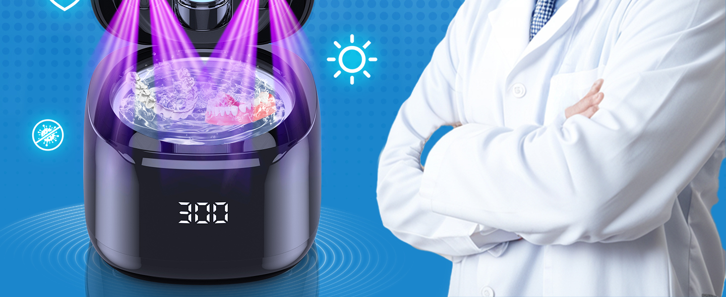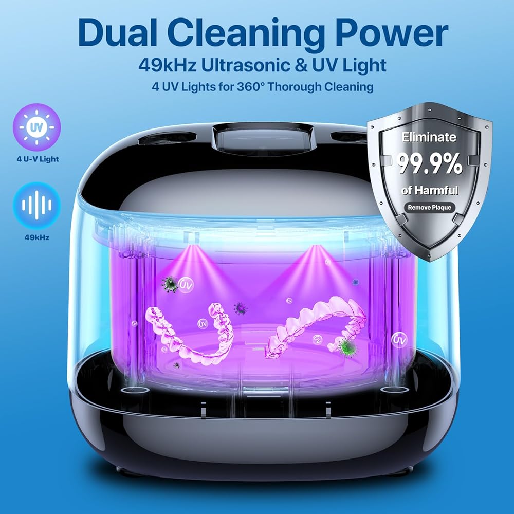 [4 UV LAMPS FOR 360° DEEP CLEANING]:This ultrasonic cleaning pod features 4 upgraded UV lamps to provide a 360° deep clean. It effectively reduces unpleasant odors, residues, and surface buildup while fully covering all items. Paired with ultrasonic waves, this dual-action design saves time and keeps your dental appliances fresh and clean. It also serves as a compact denture cleaner for your daily oral care routine.