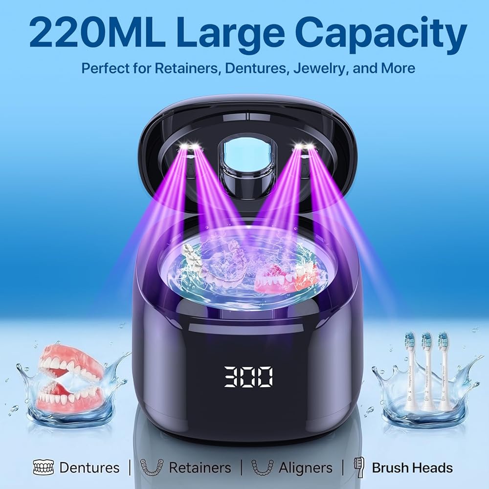 [220ML Spacious Capacity & Portable]:This 220ML spacious ultrasonic retainer cleaner offers ample space for retainers, dentures, mouth guards, toothbrush heads, electric toothbrushes and jewelry. As a multifunctional cleaning device, it boasts a compact, lightweight build despite its roomy interior. Easy to carry and store, it's perfect for home, travel and business trips, delivering convenient cleaning care anytime, anywhere.