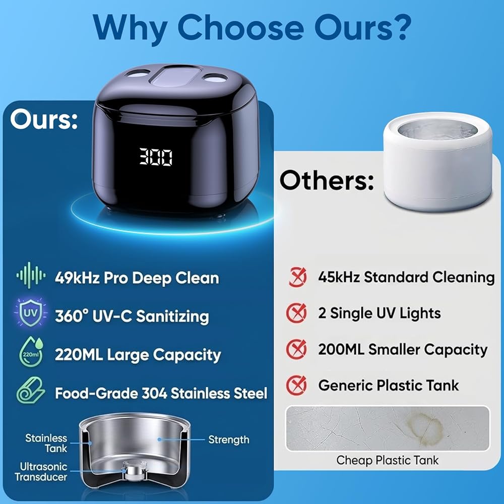 [49KHZ DEEP ULTRASONIC CLEANING]:This upgraded retainer cleaner adopts advanced 49,000Hz high-frequency vibration technology. Its powerful sound waves reach deep into every tiny crevice of your retainers, dentures, aligners, mouth guards, and toothbrushes. It effectively lifts away stubborn stains and buildup from narrow, hard-to-reach spots, delivering reliable daily care and a thorough clean.