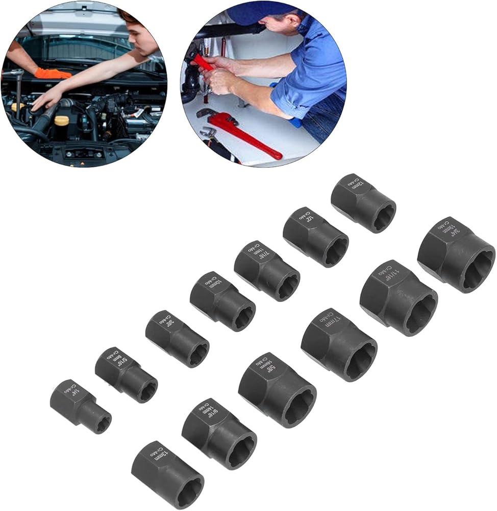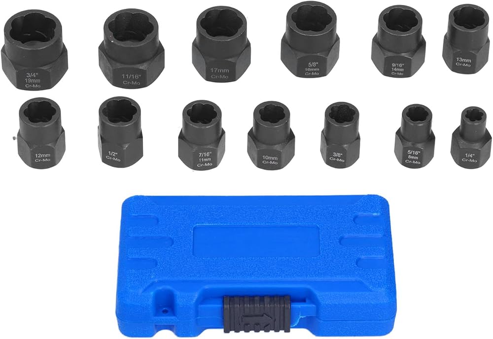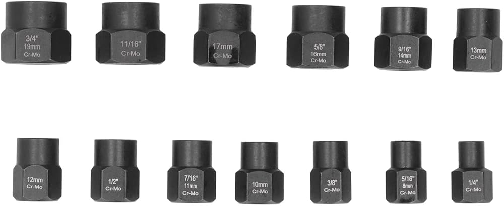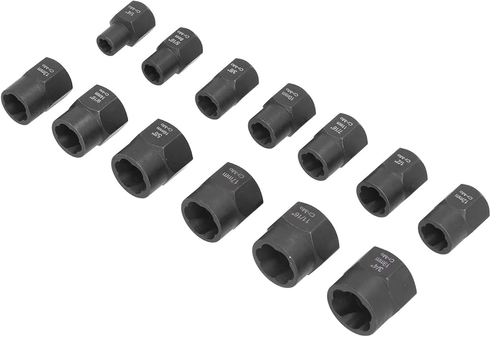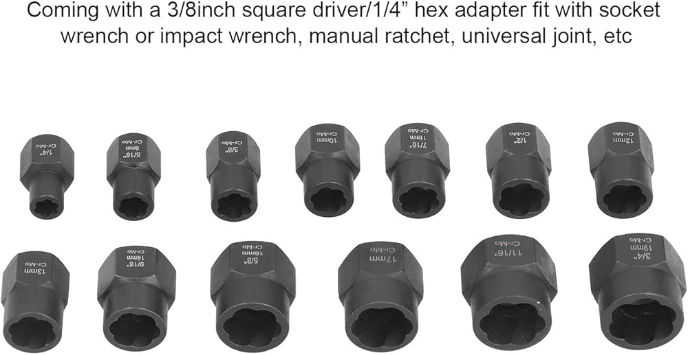 2. 13 piece 3/8" drive nut removal tool kit covering most common imperial and metric sizes: 3/4" (19mm), 11/16", 17mm, 5/8" (16mm), 9/16 (14mm), 13mm, 1/2", 12mm, 7/16 (11mm), 10mm, 3/8 inch, 5/16 (8mm), 1/4 inch.