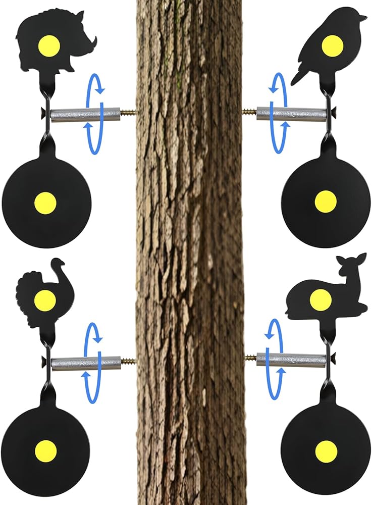 Turn your backyard into a shooting range with the Maswater 4-in-1 Animal Silhouette Spinning Target! Designed for fun and skill-building, this set features four classic hunting targets—Bird, Deer, Turkey, and Hog. Each precision-cut steel silhouette provides a engaging challenge for shooters of all levels. The auto-reset mechanism delivers instant feedback: when hit, the target spins wildly and produces a satisfying metallic ""CLANG"" sound before resetting automatically. No more walking downrange to reset—just continuous, uninterrupted shooting practice that sharpens your aim and keeps the excitement going, whether you're shooting solo or competing with friends.