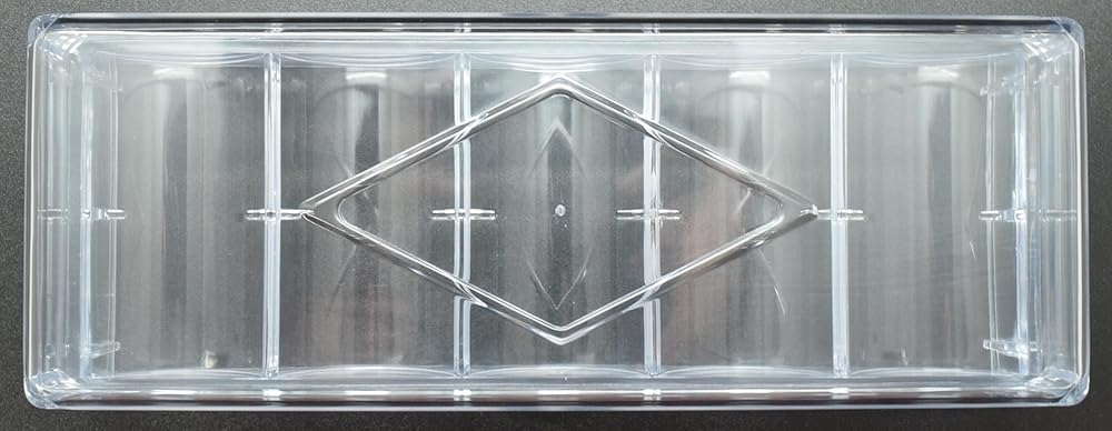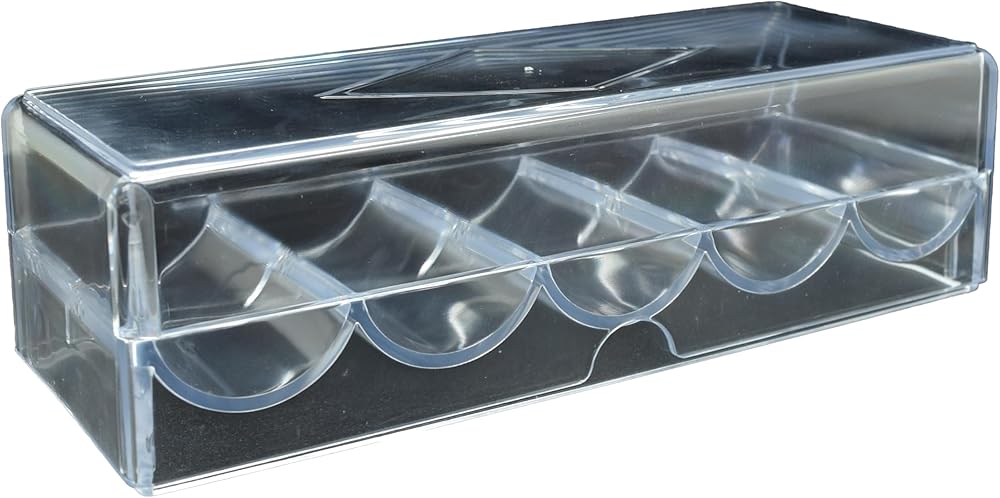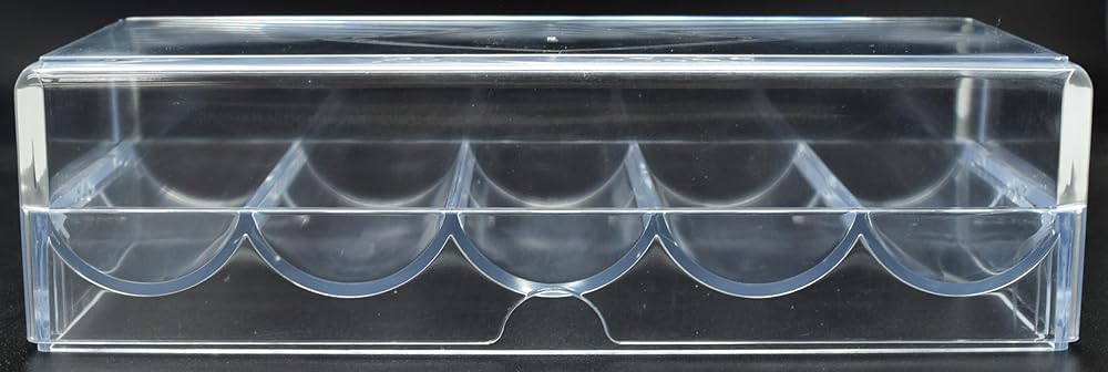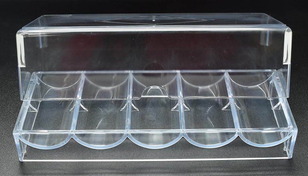 Casino style clear plastic tray for 100 39mm - 40mm poker chips. Each row is 69mm wide. Trays are stackable with or without the cover. **CHIPS NOT INCLUDED**