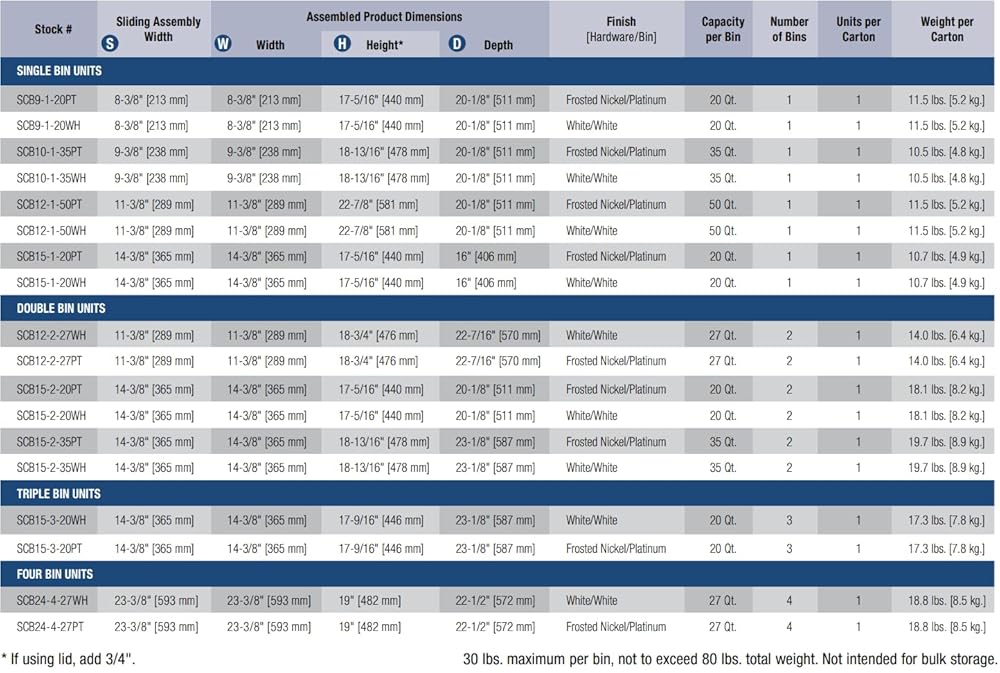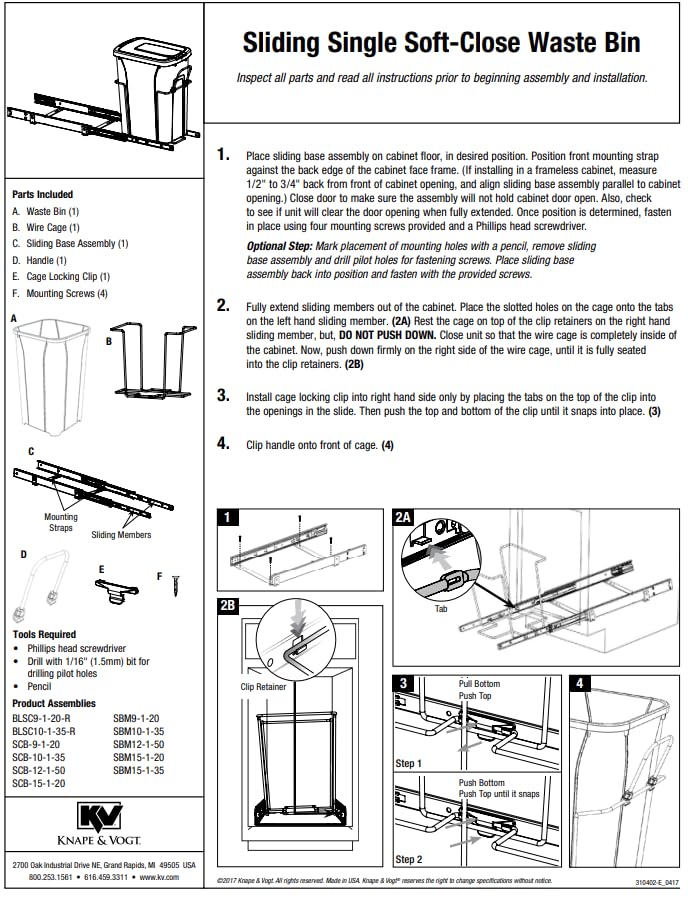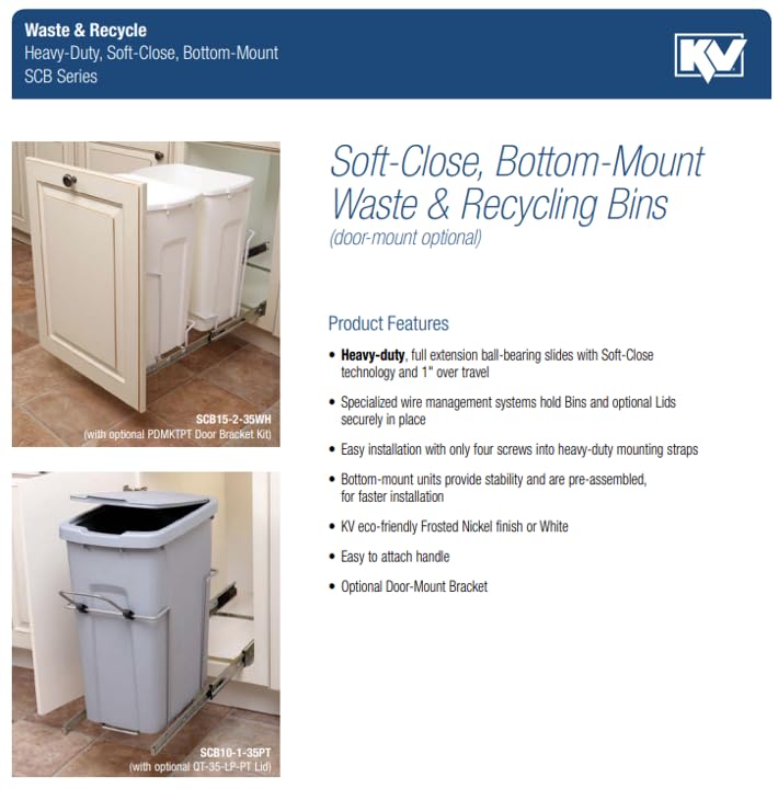 This single 20 Qt. Soft-Close Pull-Out Waste Bin, from Real Solutions by Knape and Vogt, features one 20 qt. white bin (optional lid sold separately), held securely in place on a sliding steel frame. A specialized wire management system keeps bin secure while pulling it out of the cabinet on Knape and Vogt slides that feature soft-close technology. This softly and smoothly retracts the bin back into the cabinet while closing. The optional lid helps conceal odors and secures waste bag (bags sold separately, item number QT20LB-PT). Bottom-mount unit provides stability and is preassembled for fast installation. Installs easily using only 4-screws (included). Optional door-mount bracket available (sold separately,. Item number PDMKT). Requires cabinet with a minimum opening of 9” to ensure clearance. Please note, IT IS IMPERATIVE THAT YOU MEASURE CABINET PRIOR TO PURCHASE! Actual unit dimensions as installed are 8.375” W by 17.313” H x 20.215n D.