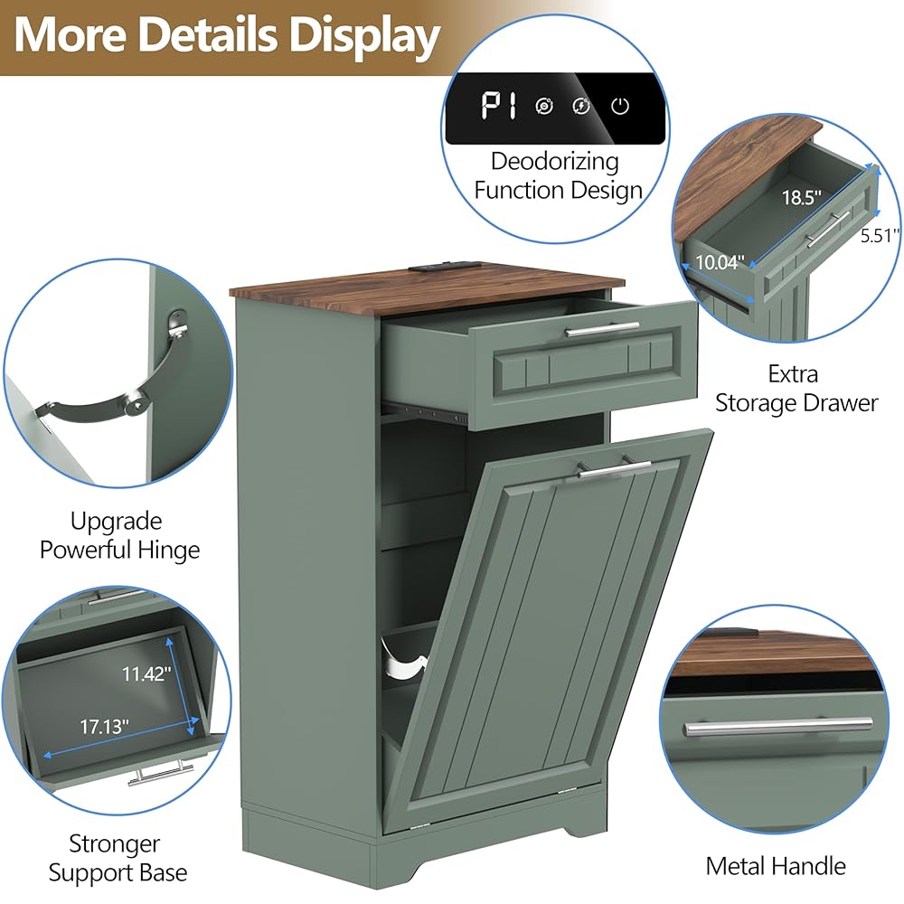 【Modern Design & Multi-Scene Use】This garbage can cabinet has a simple design and can be easily integrated into various decorative styles. It is very suitable for your kitchen and dining room, and can also be used as a laundry hamper cabinet in the washing room. The storage drawer above can be used to place tableware, bottle openers and other kitchen utensils.