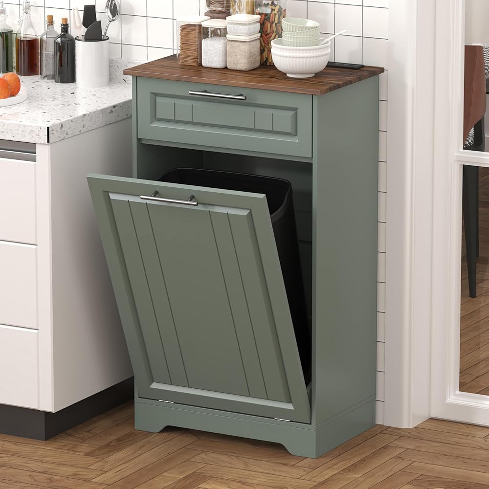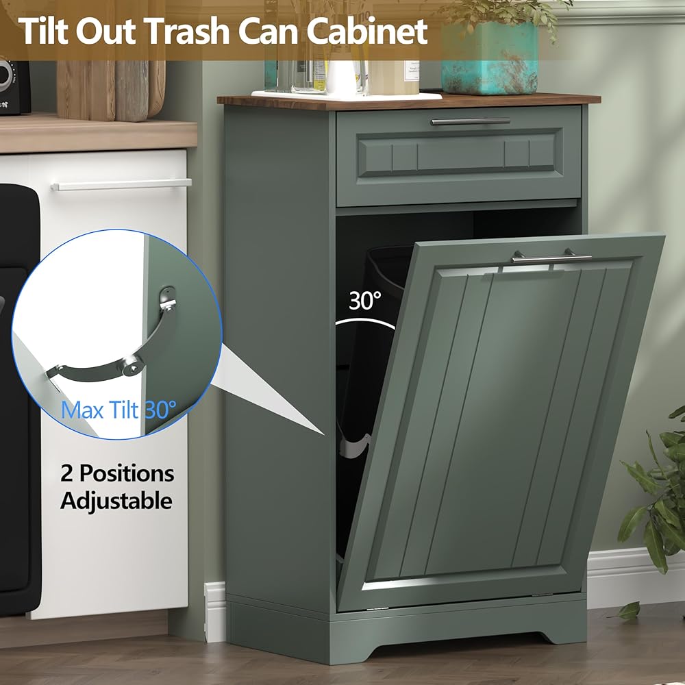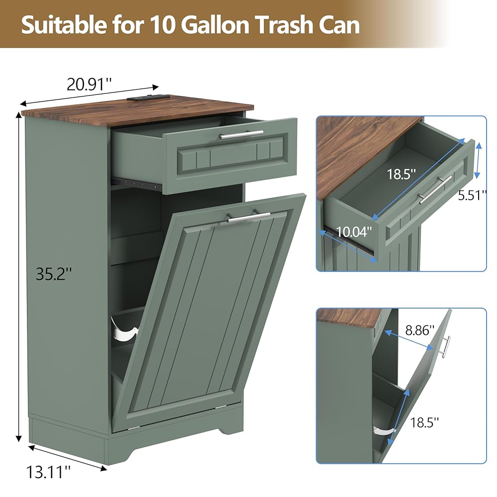 Single 10 Gallon Tilt Out Trash Can Cabinet with Deodorizing Function, Wooden Hidden Garbage Can Holder with Storage Drawers for Kitchen and Dining Room, Laundry Hamper Cabinet for Bathroom, Green