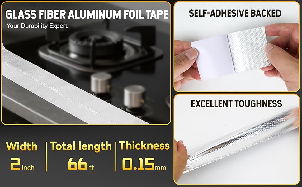 [Heat Resistant Tape]: Our high temp tape is made by bonding glass fibre cloth to aluminum foil staying wear-resistant even with frequent use. This metal tape, at 66ft, is more than long enough for regular needs