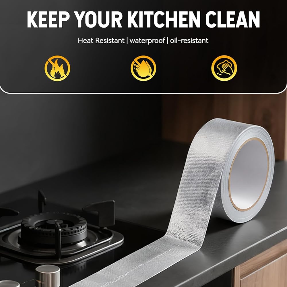 [Strong Sealing]: This aluminum foil insulation tape has excellent waterproof, oil-proof, and sealing properties — perfect for sealing kitchen stove gaps to block oil from seeping in and hard to clean, or for pipe joints to prevent leaks