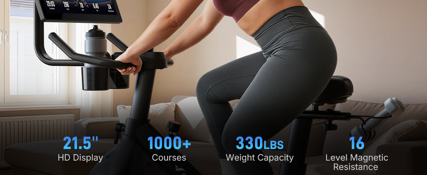 🖥️ 21.5" HD Rotatable Screen for Immersive Workouts – The S36L3 exercise bike features a large, high-definition display that swivels 180° and tilts up to 60° to reduce glare, letting you enjoy a true gym-like cycling experience at home. Screen sharing or mirroring from your mobile device is supported for watching videos on this stationary bike for home. **Note: Not compatible with iPhone 17 Series and Google Phone.