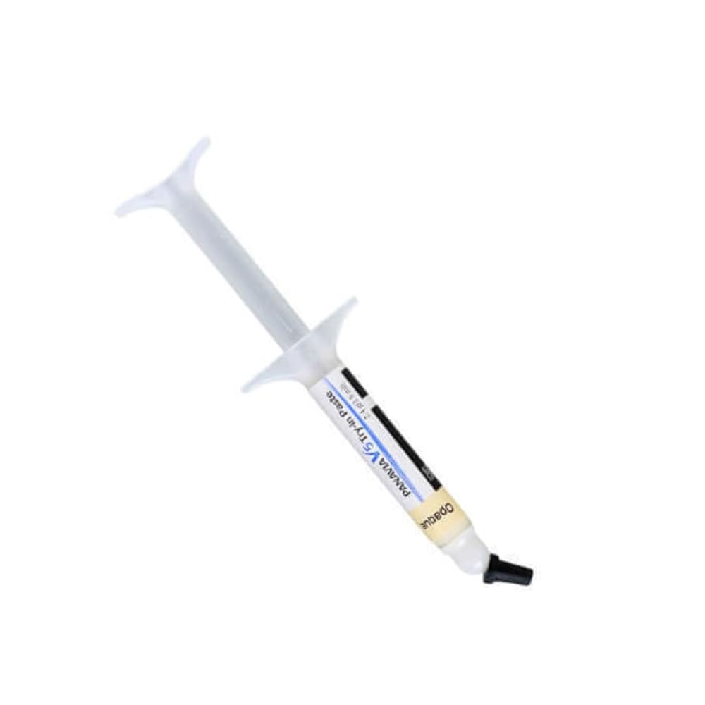 Panavia V5 Universal Resin Cement - Try-in Paste. Opaque shade, 1.8 mL Syringe. A try-in paste to evaluate the shade prior to cementing with Panavia V5 cement. Exact color match with the paste.