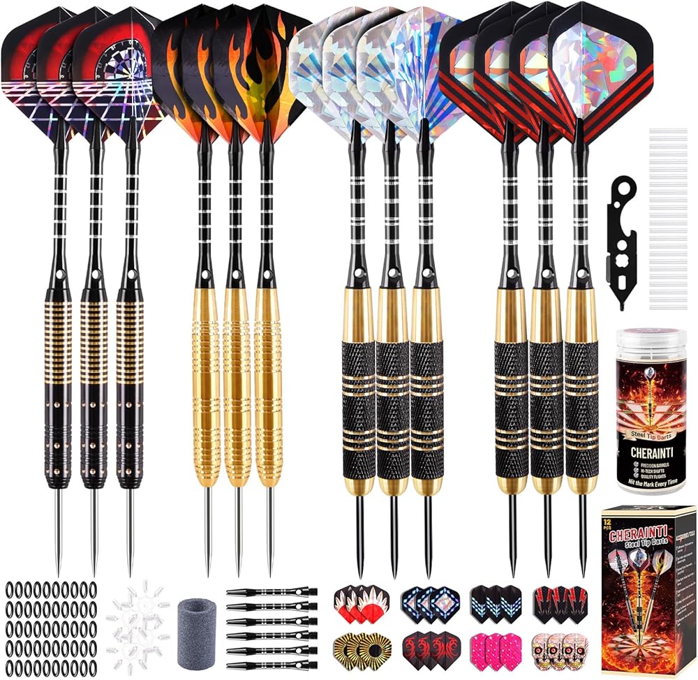 CHERAINTI Darts Metal Tip Set, Professional Steel Tip Darts, 20g 24g Pro Metal Tipped Dart Set for Dartboard with Brass Barrels, Aluminum Shafts, Extra Flights, Sharpener Tool Kit, and Carrying Case