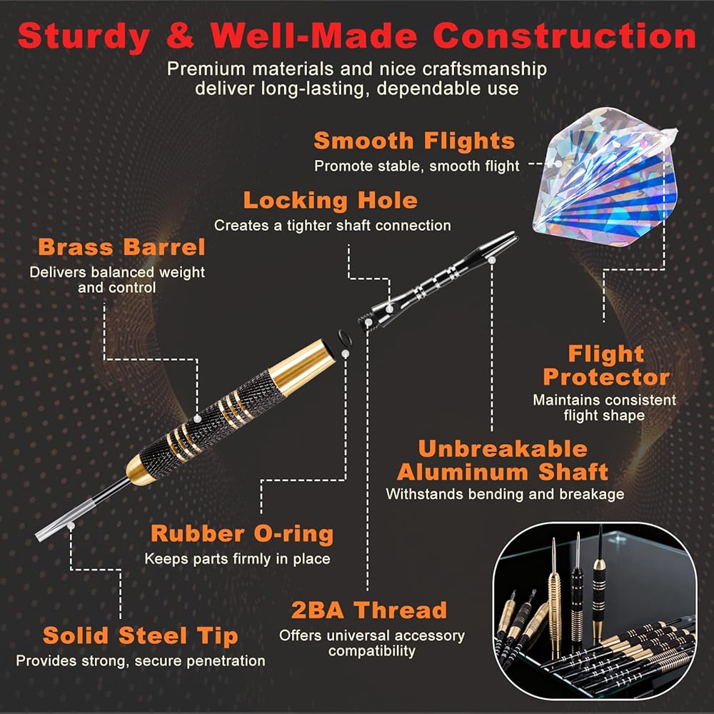 Sturdy & Well-Made Construction: This professional darts set features exquisite craftsmanship; Sharp stainless steel tips resist bending, solid aluminum shafts are strong and won't crack, and premium laser flights provide stable, consistent flight