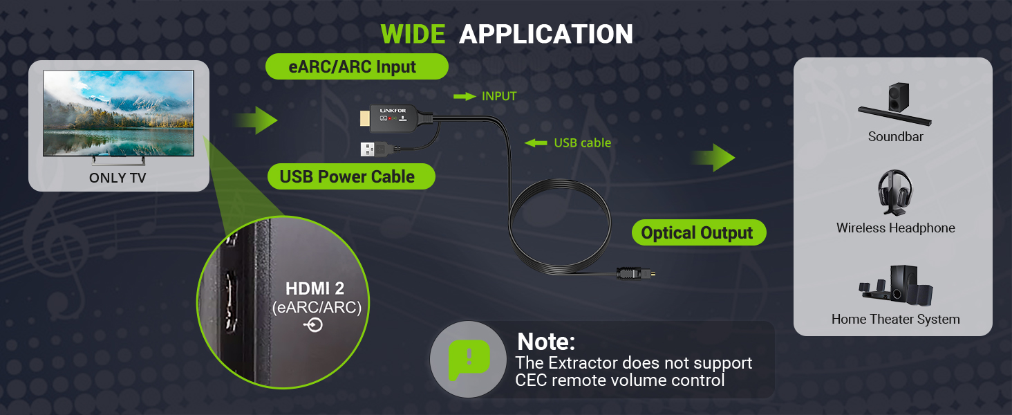 Universal Compatibility : Works with smart TVs, soundbars, home theater systems and wireless headphones(Note: Does not support CEC volume control due to fiber optic limitations)