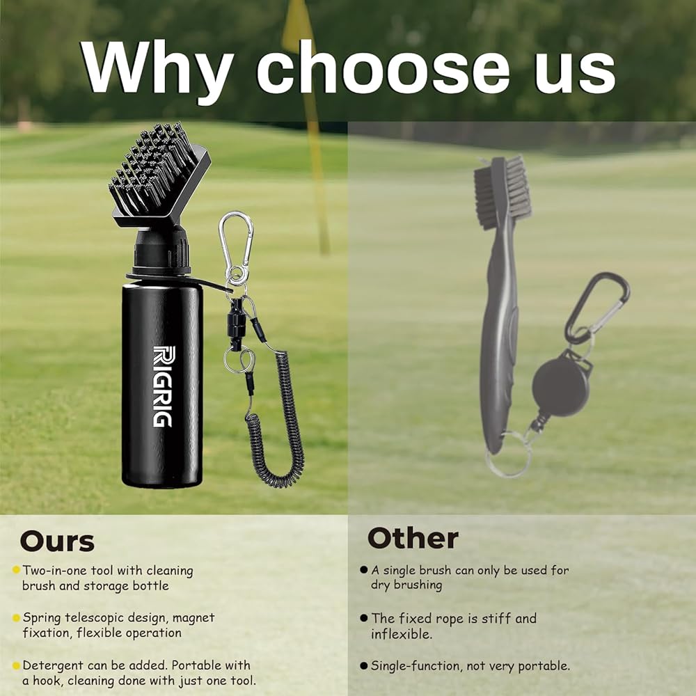 【Durable Golf Club Cleaner Brush】Our golf club scrubber features durable nylon bristles—safe for all club finishes—that power through stubborn dirt with ease. Plus, the integrated 4oz water bottle enables deeper, more thorough club cleaning, meeting all your on-course maintenance needs and giving you the edge to play with total confidence every time.