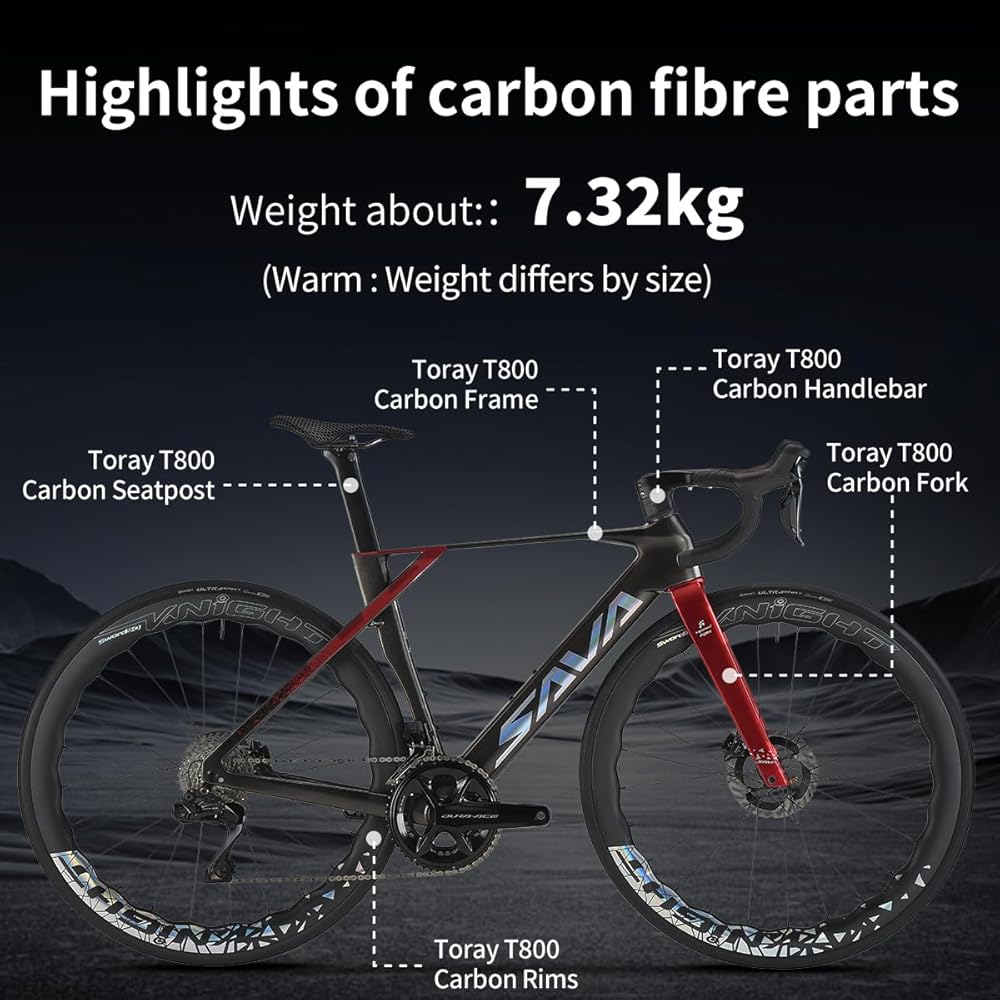 【Ultra-Light T800 Full Carbon】Experience elite road racing performance with a complete ultralight 7.32kg build. Every component—frame, fork, wheels, handlebar, and seatpost—is crafted from carbon fiber to deliver razor-sharp power transfer and superior climbing efficiency