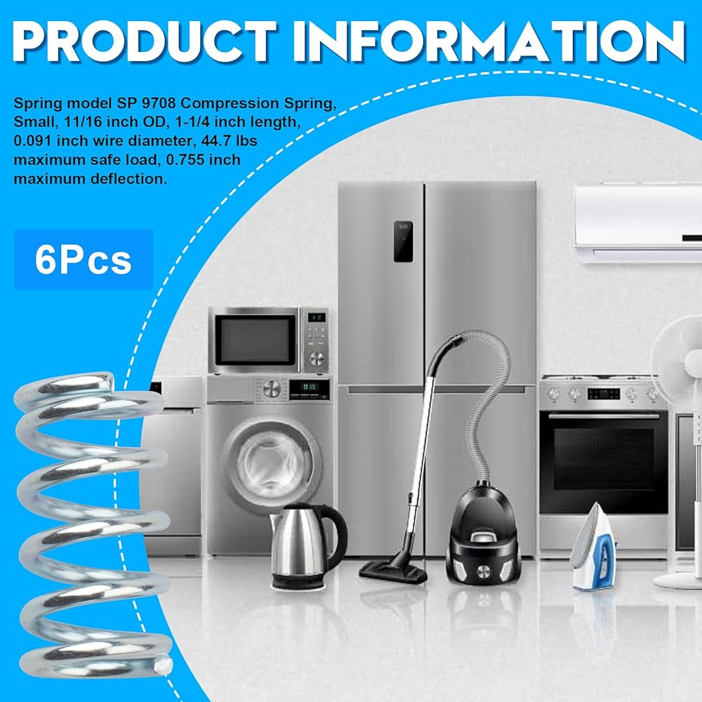 Product Information:Spring model SP 9708 Compression Spring, Small, 11/16 inch OD, 1-1/4 inch length, 0.091 inch wire diameter, 44.7 lbs maximum safe load, 0.755 inch maximum deflection. With your purchase you will receive 6 brand new SP 9708 compression springs for your use and spare needs