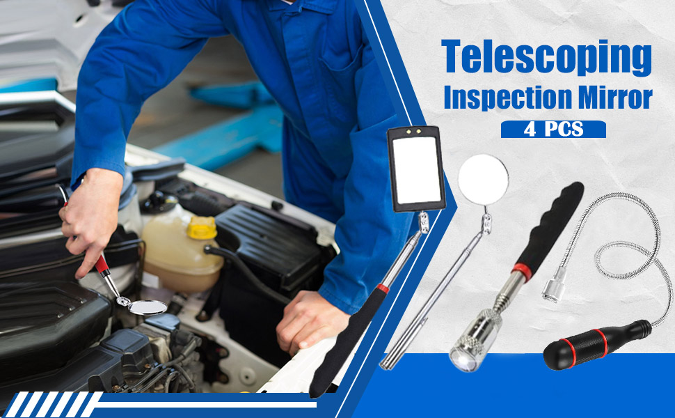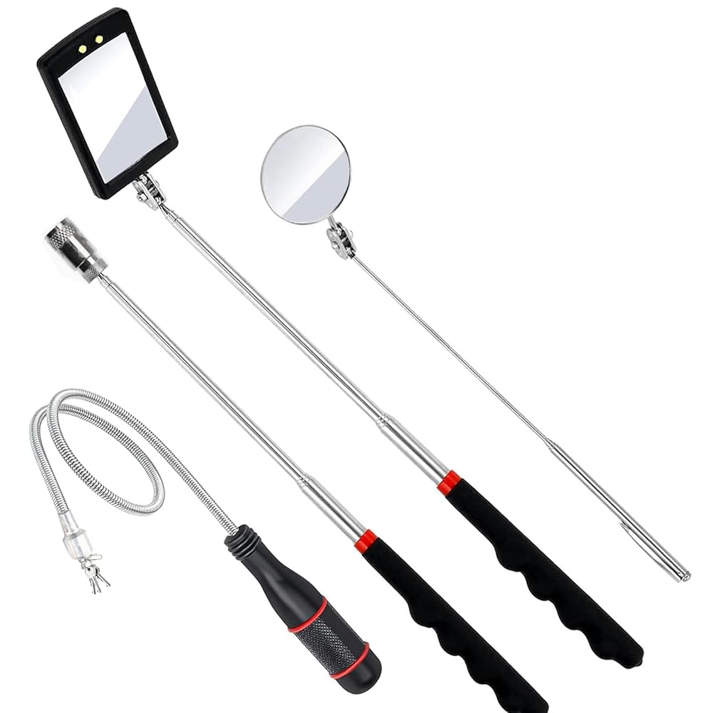 Packaging: You will receive a square illuminated inspection mirror, a circular inspection mirror, a illuminated magnetic pickup rod, and one flexible magnetic pick-up tool