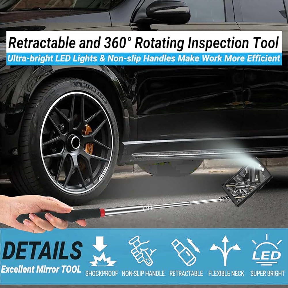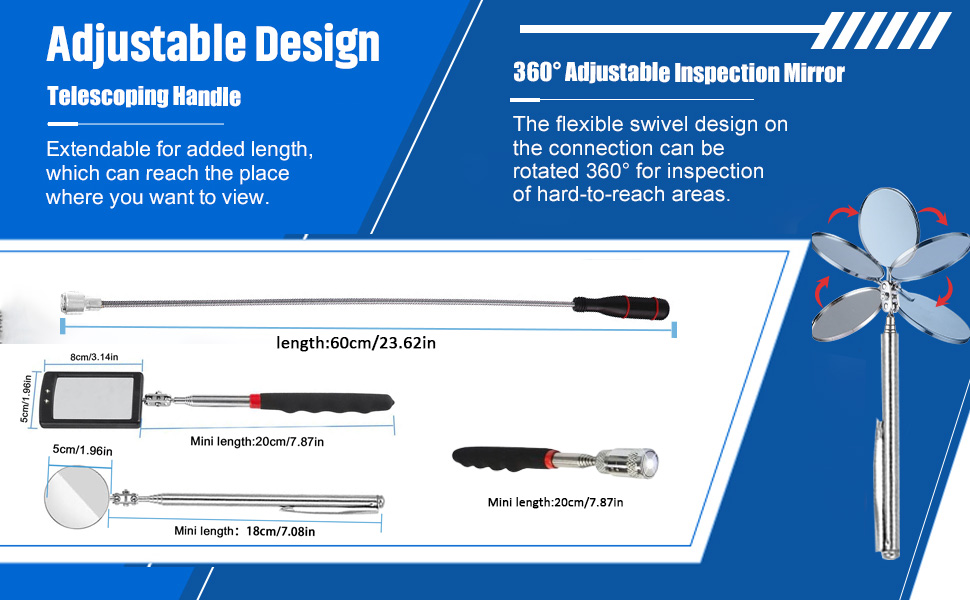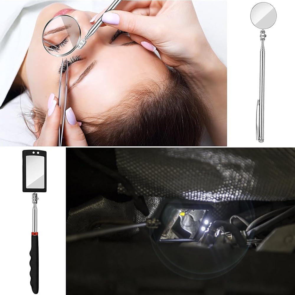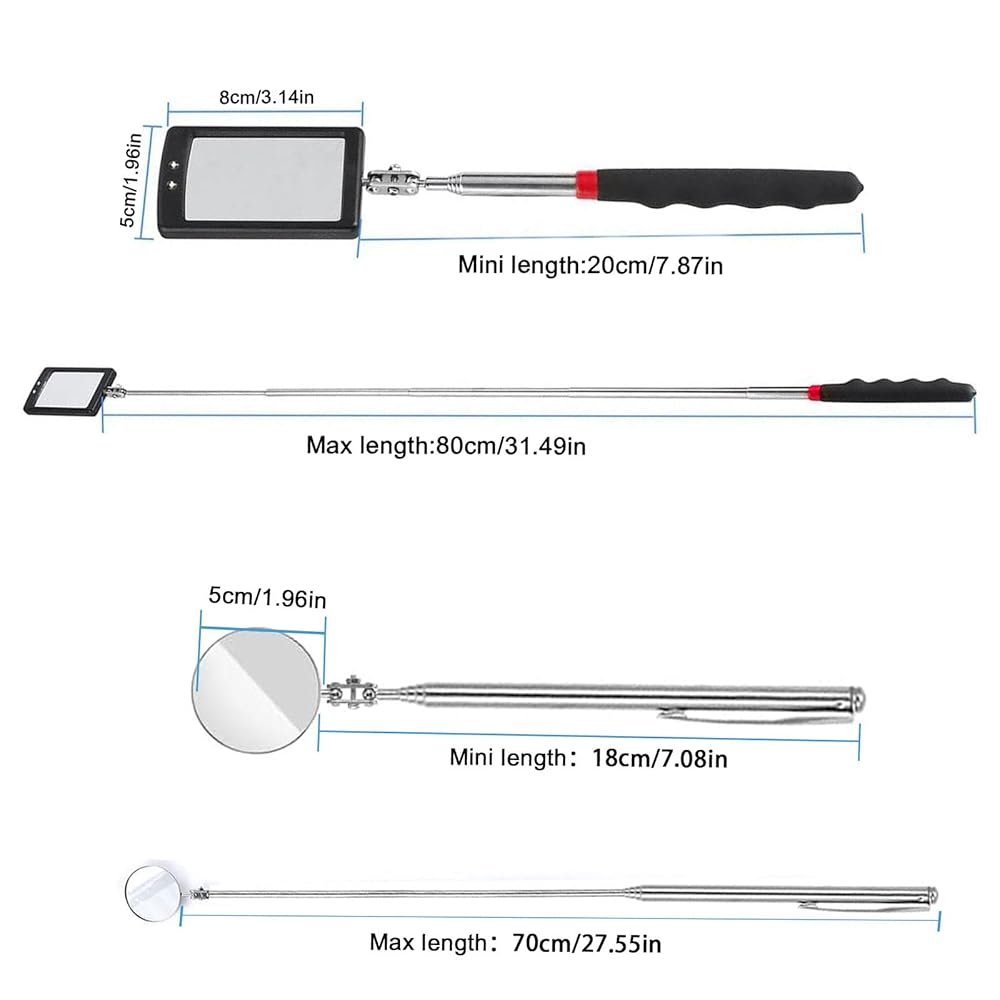 【Square Illuminated Inspection Mirror】The inspection mirrors can all rotate 360 degrees to provide you with an all-round view.And the square telescopic mirror also has a light for use in low light areas