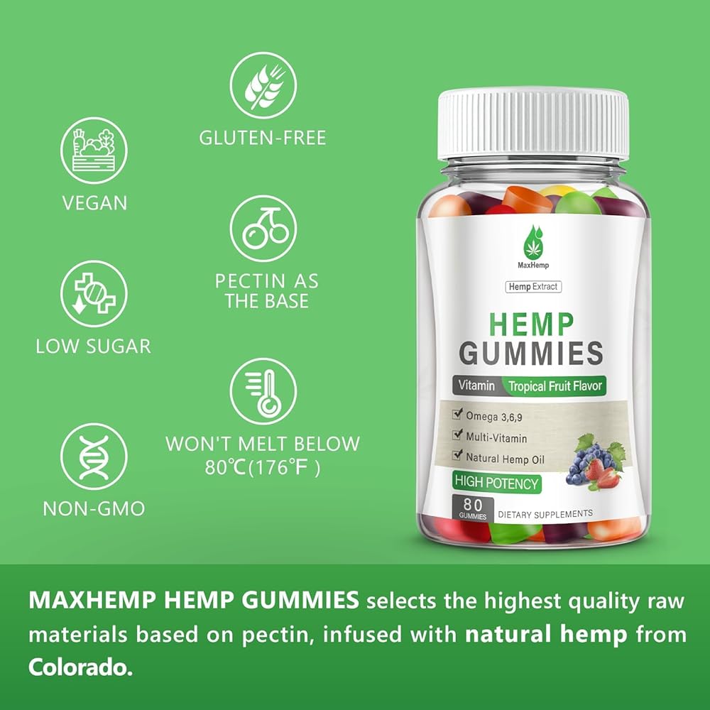• MAXHEMP HEMP GUMMIES for Sleep, Pain, Anxiety contains pure hemp plant (Foliage,Stalk ets,) extract per serving combined with essential fatty and vitamin E to promote overall health.
