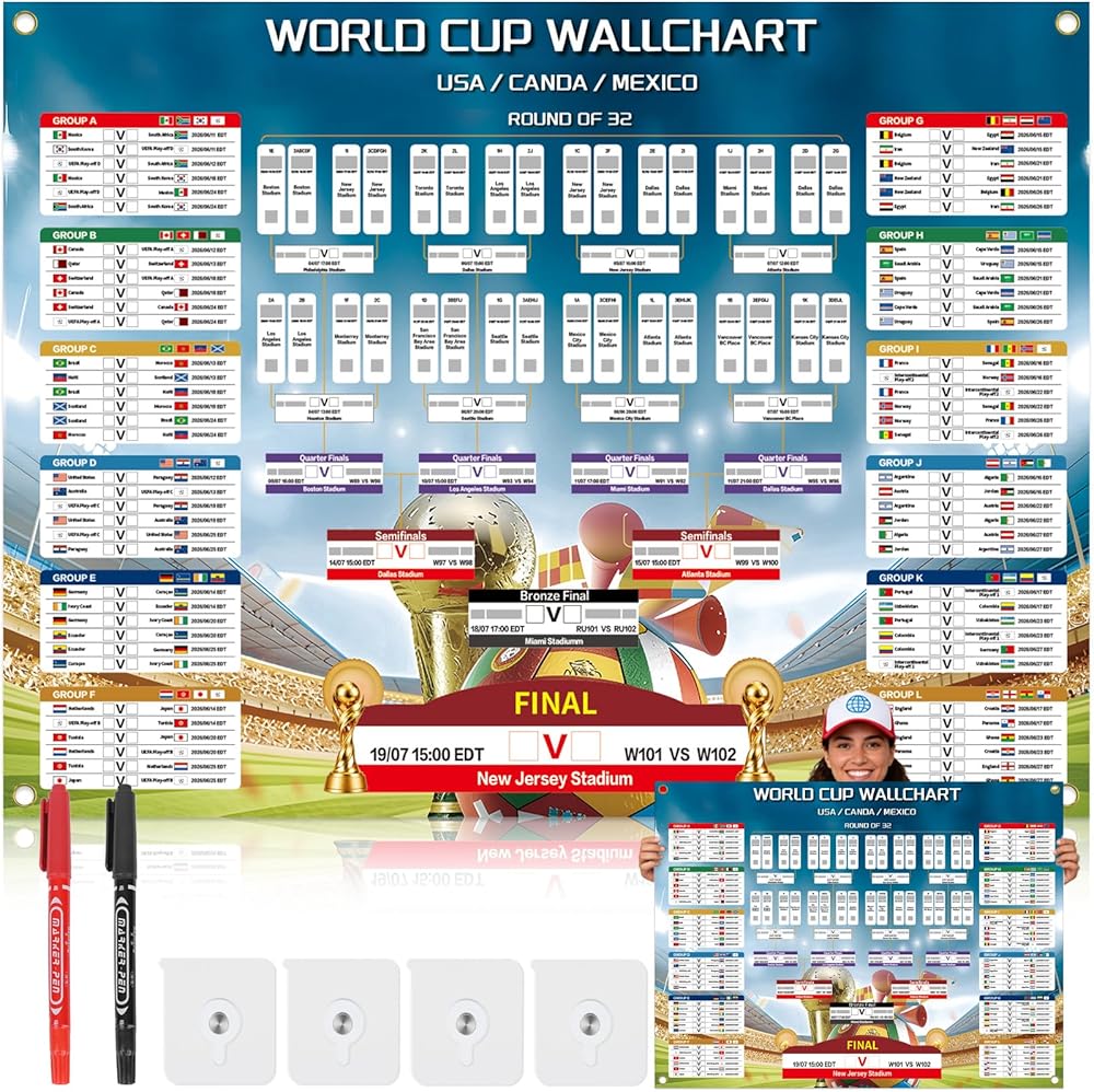 This comprehensive world cup poster world cup schedule poster is a 2-in-1 interactive tool detailing the 48-team tournament. Measuring 47x35 inches on durable oxford fabric, this 2026 soccer schedule banner serves as a clear world cup wall chart and excellent 2026 world cup merchandise for any fan.