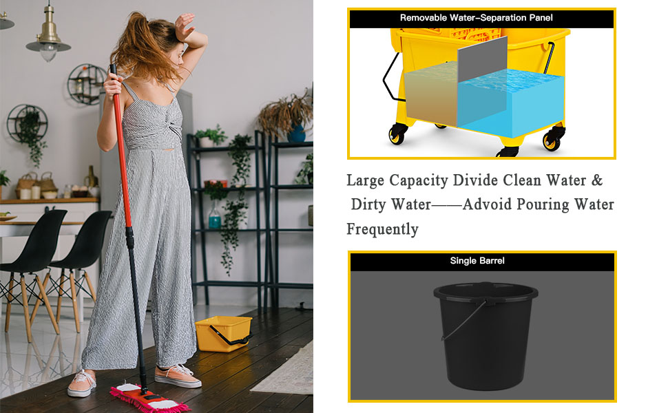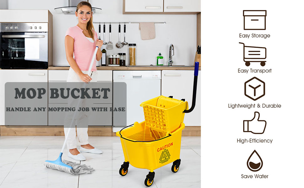 💡【Large Capacity】This mop bucket features a large volume of 35 Quarts/32 liters, which works well for cleaning a large floor. Even large mops can be stacked up and cleaned up without any problems.