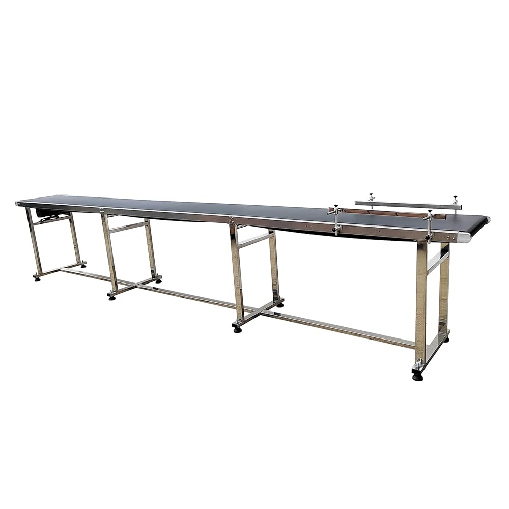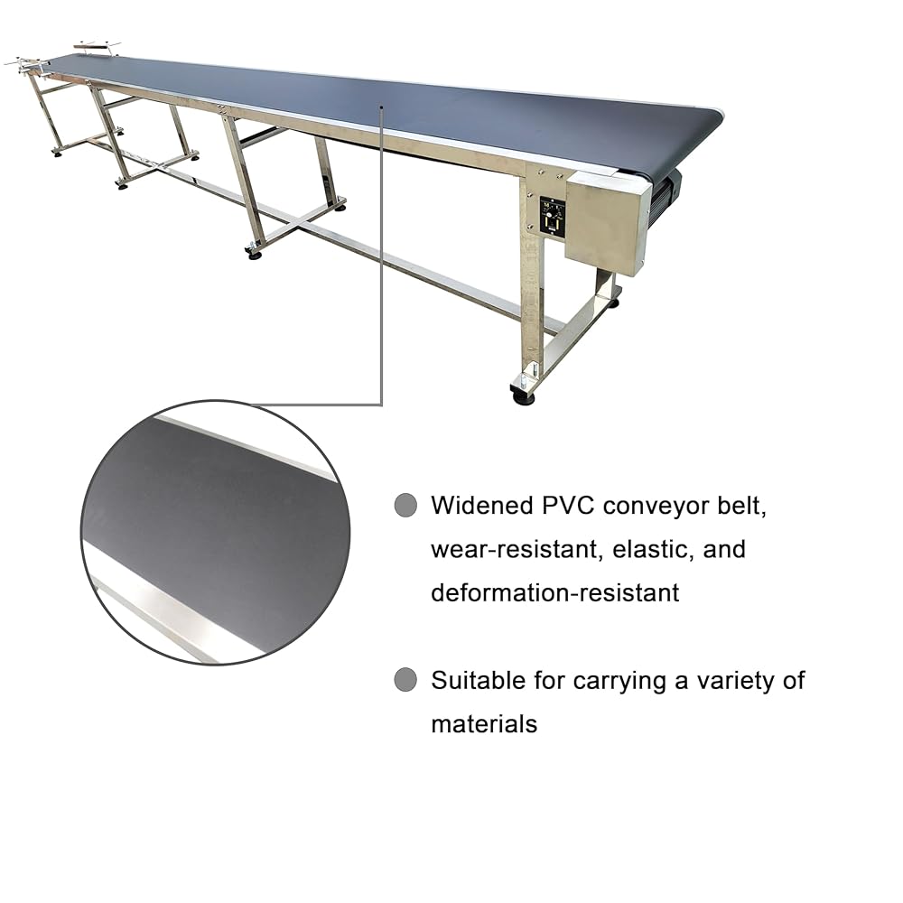 [Extended and Widened Surface] The conveyor belt is made of PVC material. Its frame is constructed from stainless steel. It measures 177 inches long, 11.8 inches belt wide and 29.5inch high.