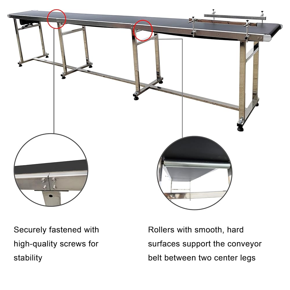 [Non-Slip Base] The conveyor comes with a rubber base and 8 pieces of 4inch long threaded rods for securing the frame. The height can be adjusted slightly by turning the threaded rods. The rubber material of the rods also provides slip-resistant function.