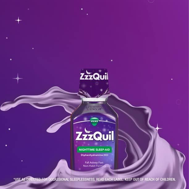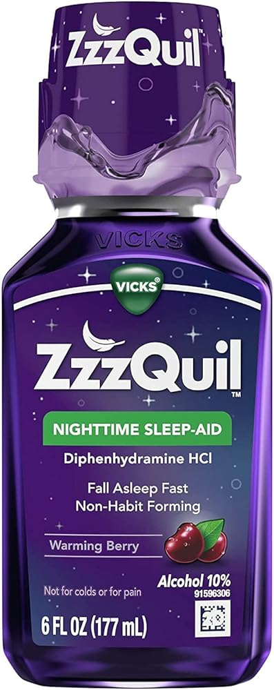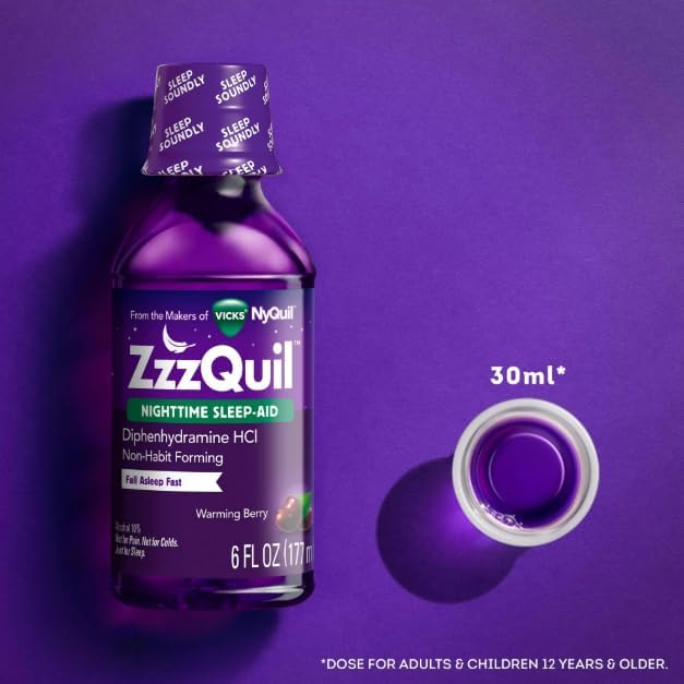 ZzzQuil Liquid Sleep Aid in Warming Berry Flavor is designed for occasional sleeplessness, helping you drift off in as little as 20 minutes when you need extra support at night. Formulated with diphenhydramine HCl, this non-habit-forming sleep-aid helps promote restful sleep so you can wake feeling refreshed and ready for the day ahead. Each 30 mL dose contains 50 mg of diphenhydramine HCl and should only be taken when you have enough time to get a full night's rest (7–8 hours). With a warming berry flavor and liquid format, ZzzQuil is easy to take and convenient when bedtime feels out of reach. NDC:37000-500-06; UPC:323900013964